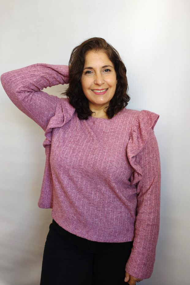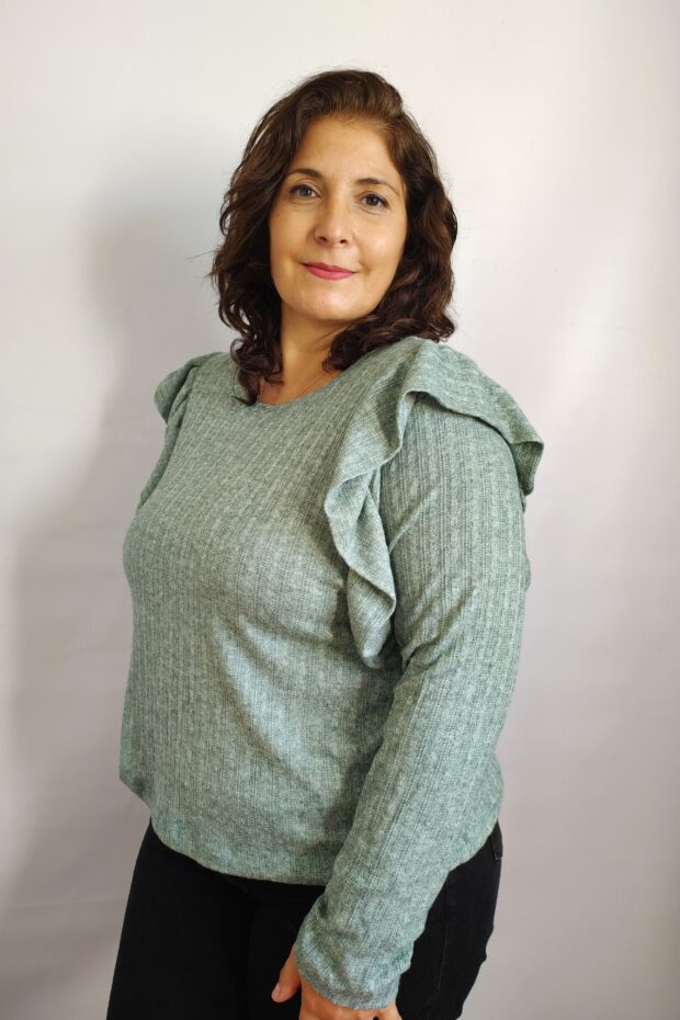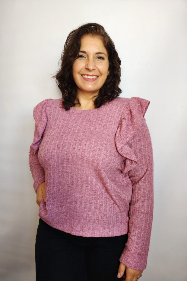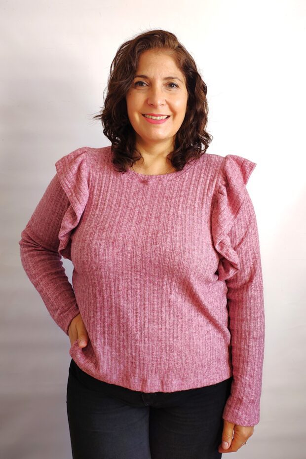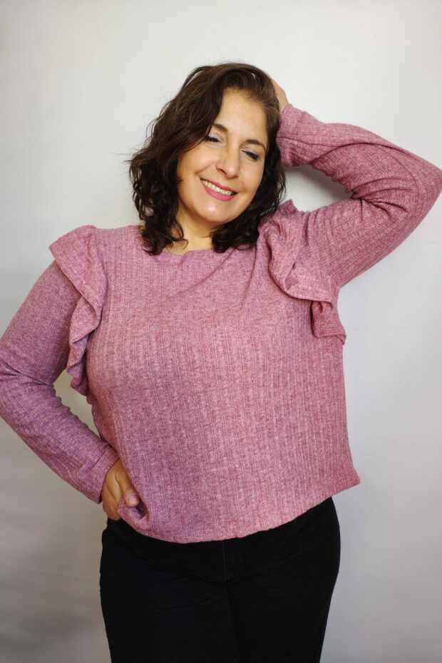 Descripción: Sweater de lanilla de cuello redondo con volados fruncido