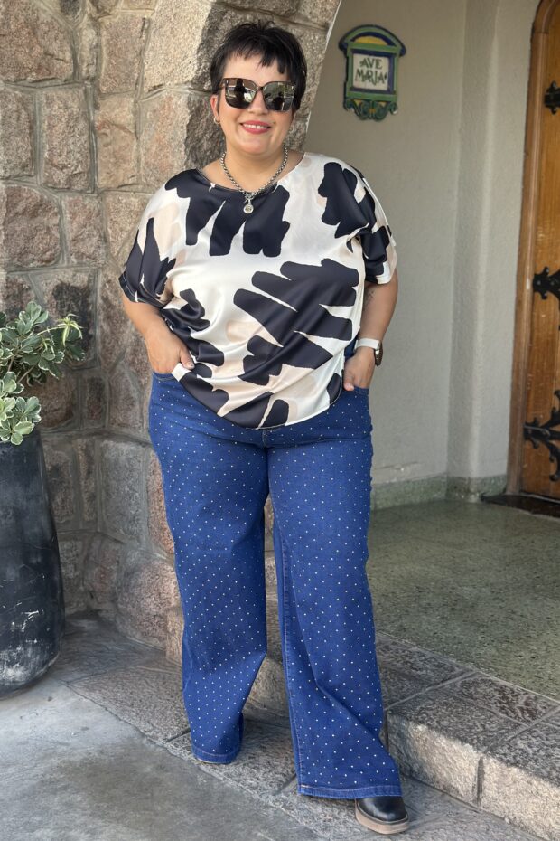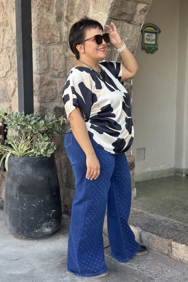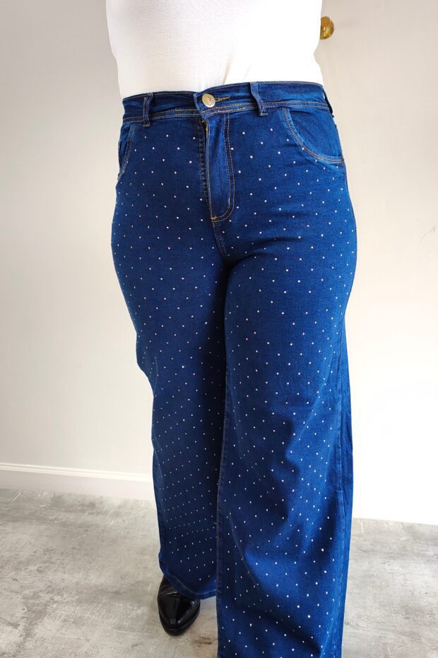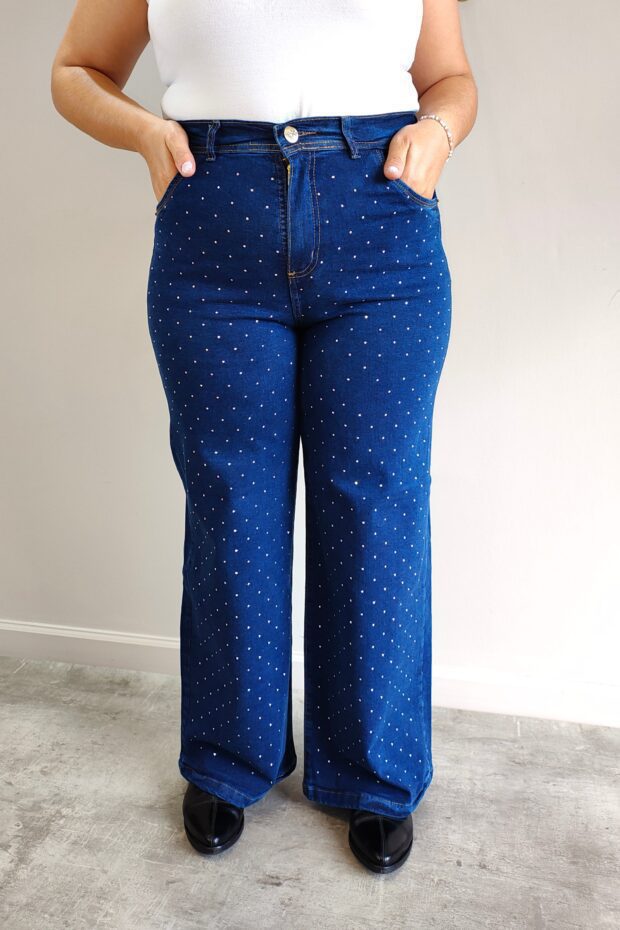 Denim elastizado, estilo wide leg, con brillos en la parte delantera, tiene bolsillos.