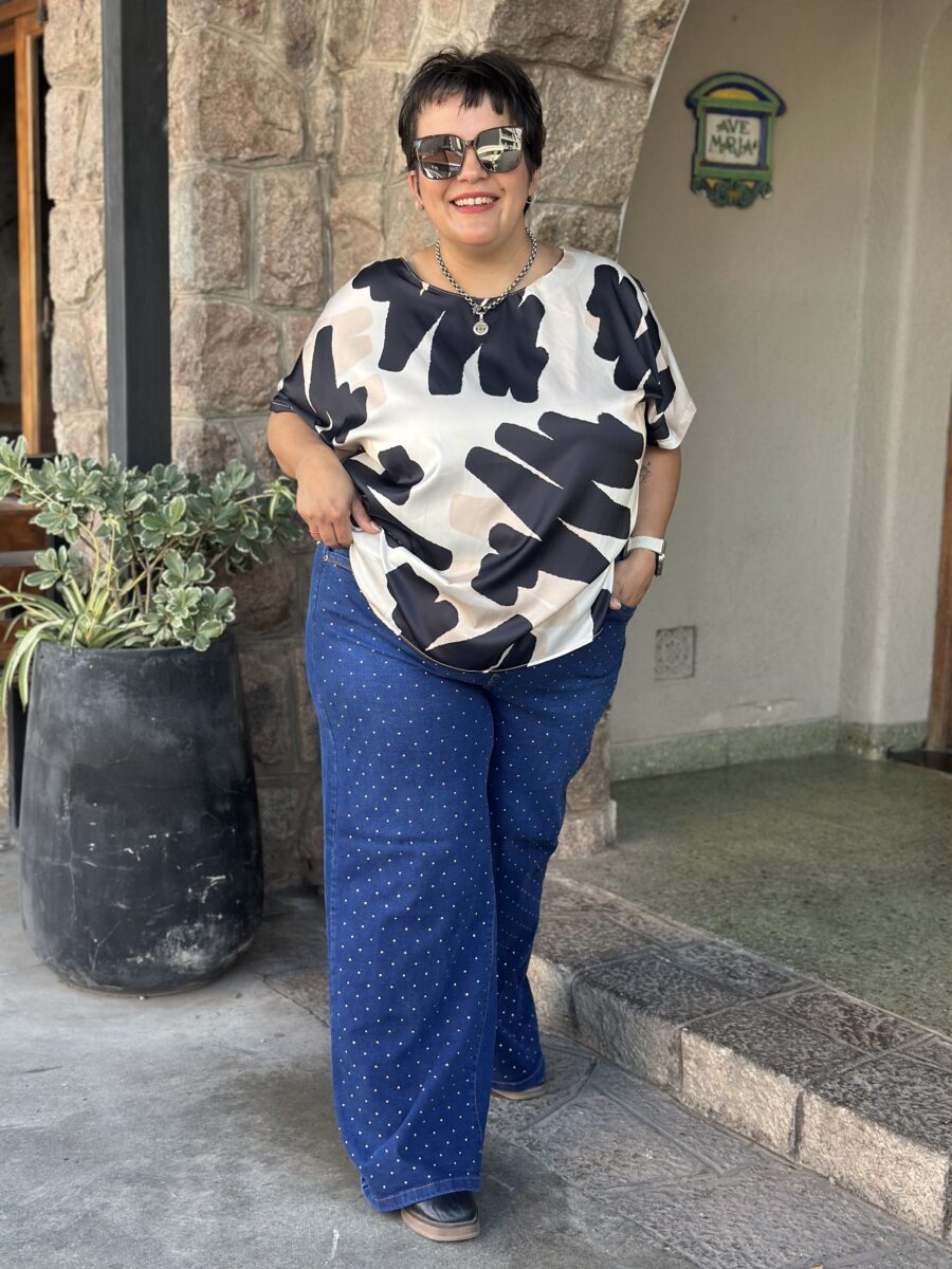 Denim elastizado, estilo wide leg, con brillos en la parte delantera, tiene bolsillos.