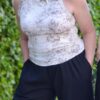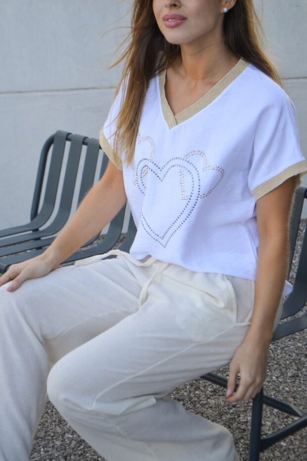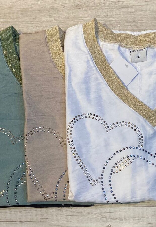 Remera en Crepe con Cuello y puño de lurex dorado y detalles de tachas.