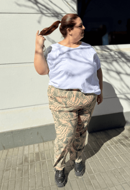 Estefi usa talle 60 y sus medidas son Busto: 137 cm., Cintura: 121 cm., Cadera:, 155 cm.