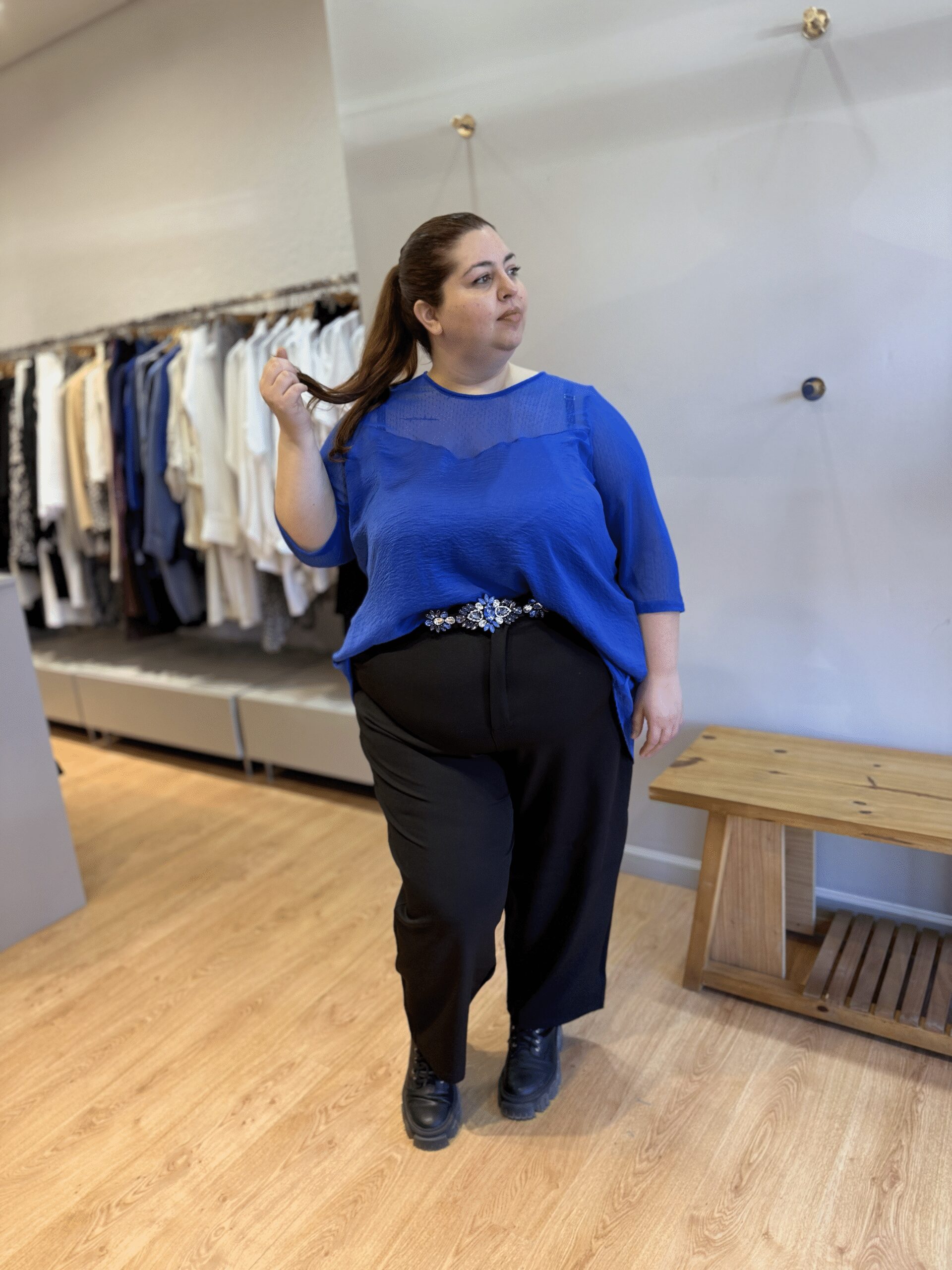 Estefi usa talle 58 y sus medidas son Busto: 137 cm., Cintura: 121 cm., Cadera:, 155 cm.