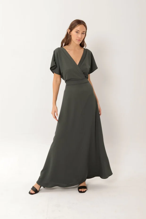 Tiene ajuste en bajo busto, escote en V y mangas caídas. El ajuste en espalda es con costura elástica que le da cierta versatilidad en los talles.