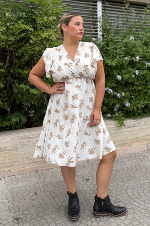 Vestido cruzado con corte bajo busto elastizado, falda evasé. manga volado.