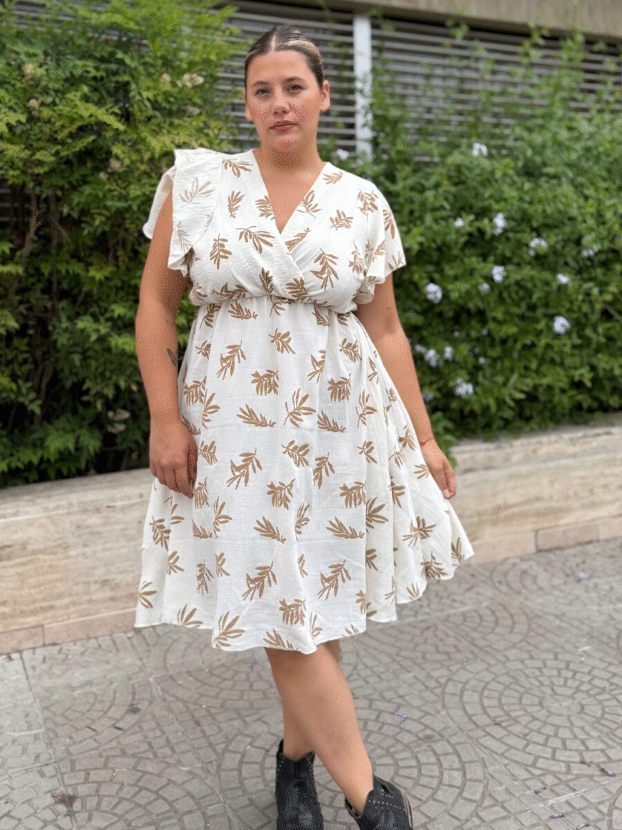 Vestido cruzado con corte bajo busto elastizado, falda evasé. manga volado.