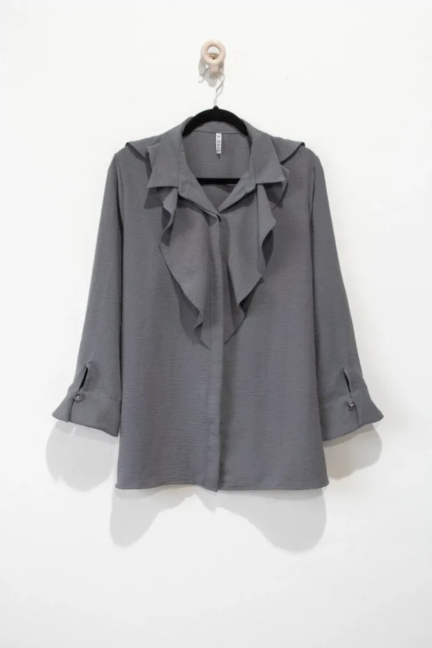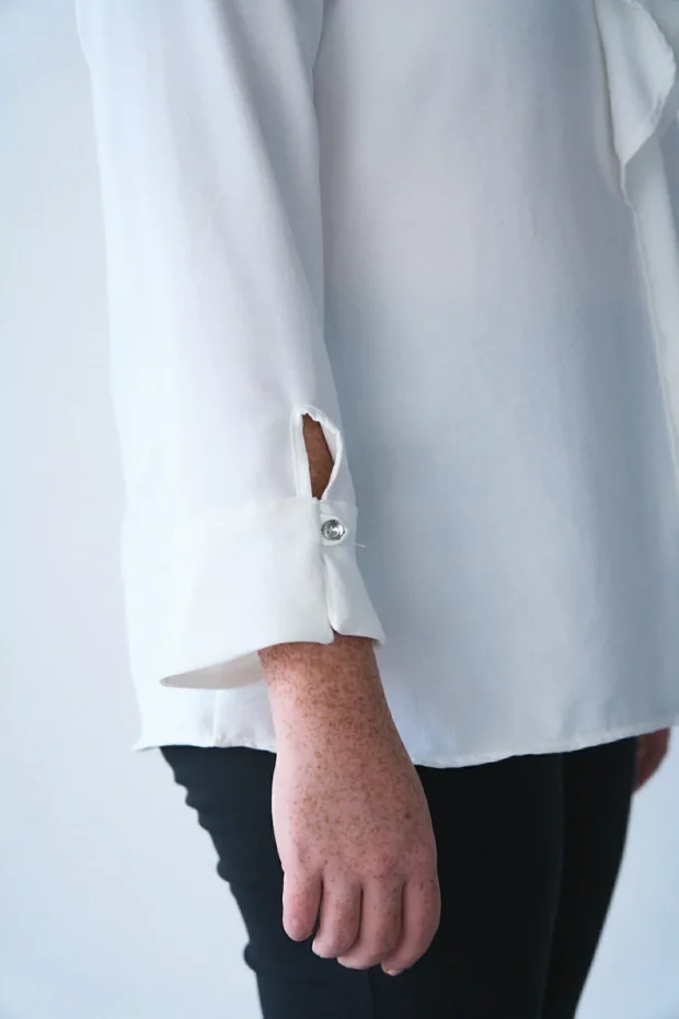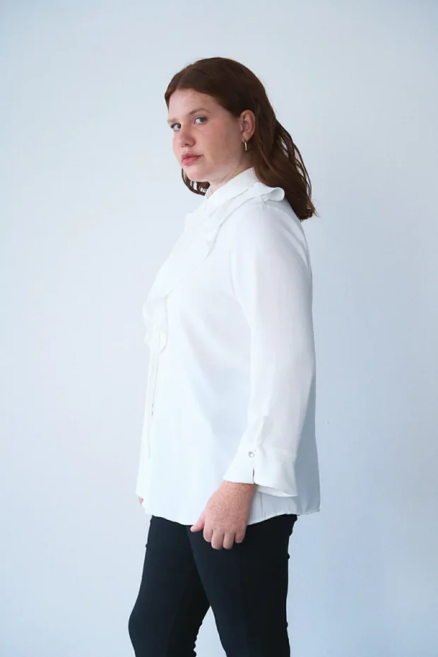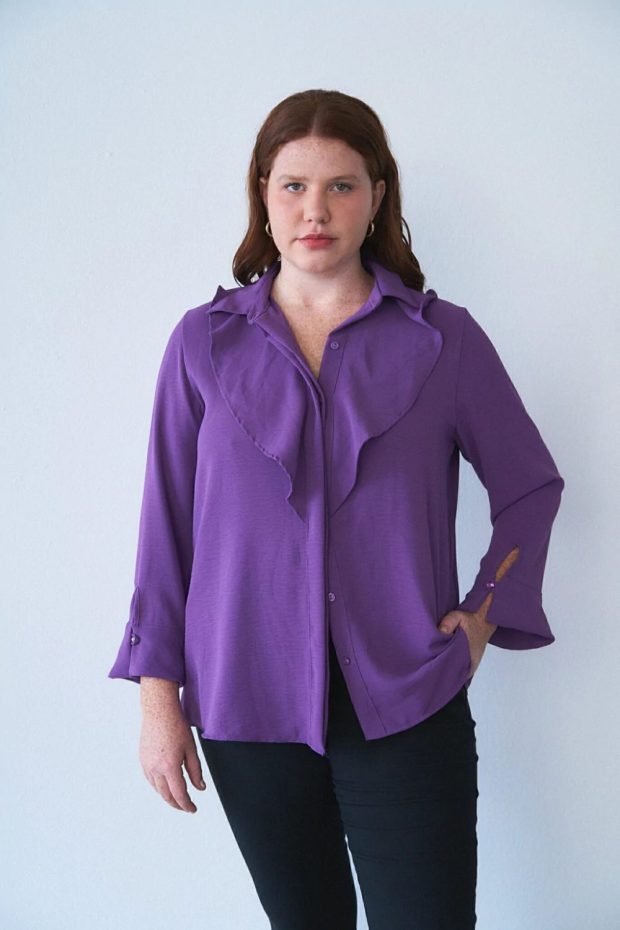 Descripción: Camisa de manga larga con volado estilo shabot y cartera oculta