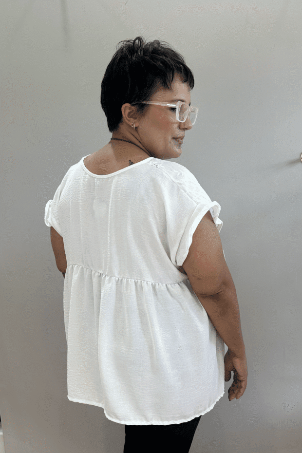 Descripción: Blusa amplia escote en v con canesú delantero de broderie y frunces
