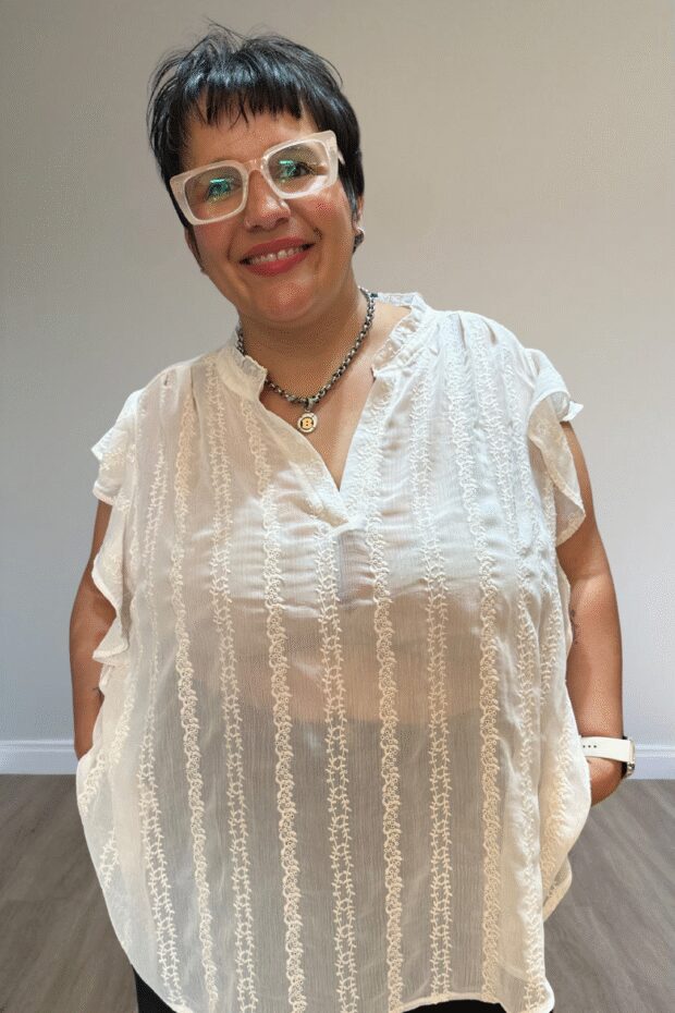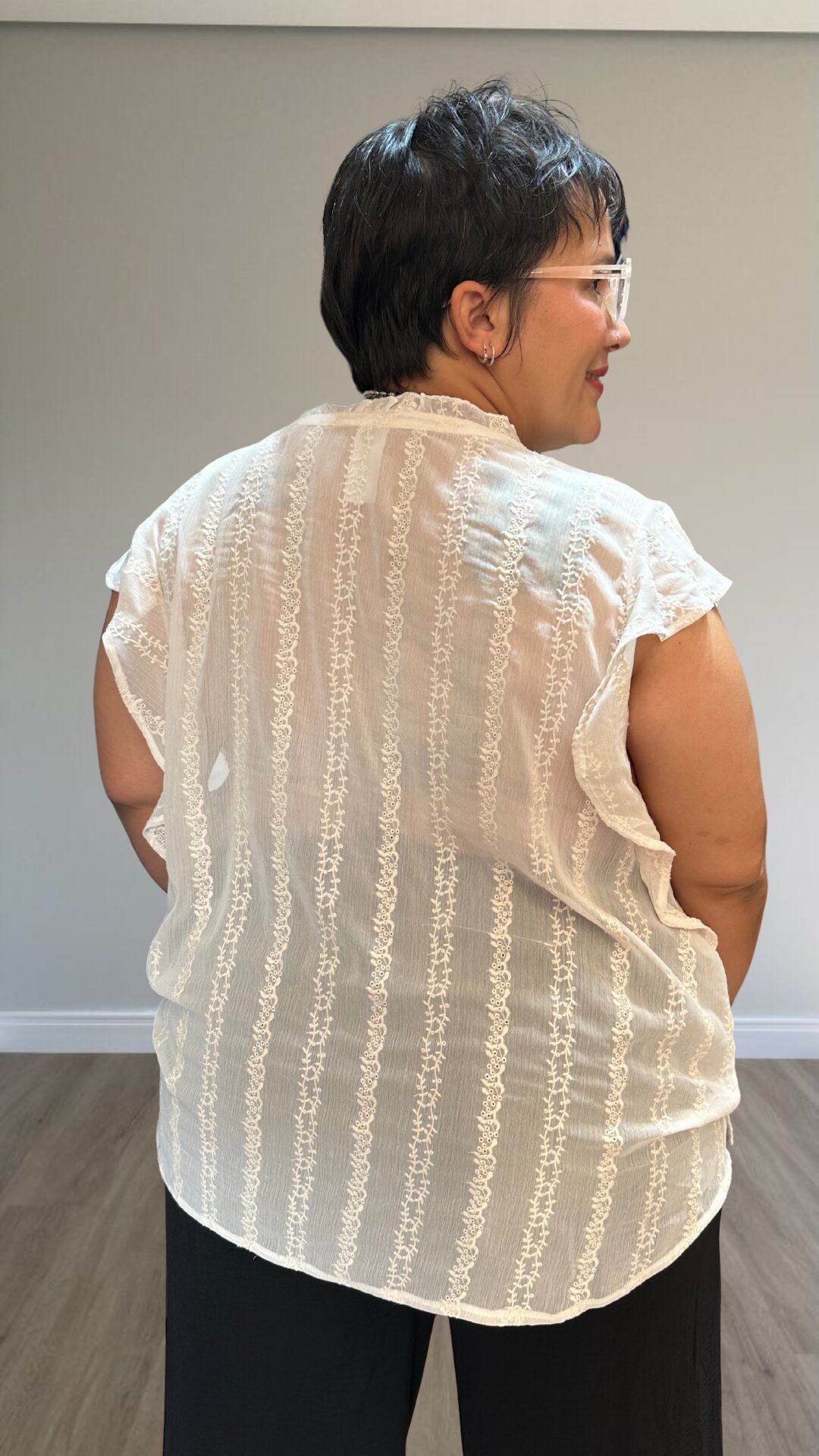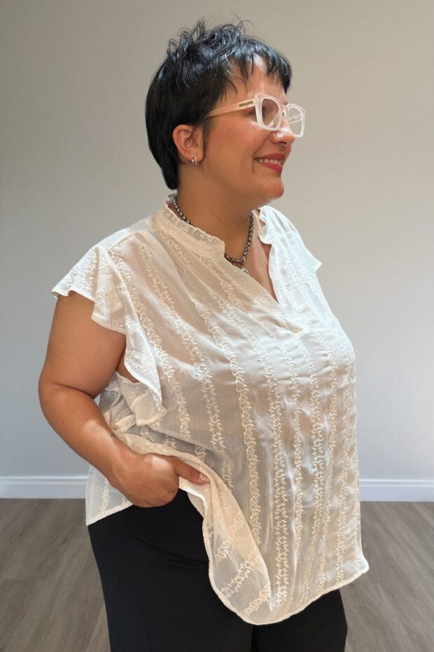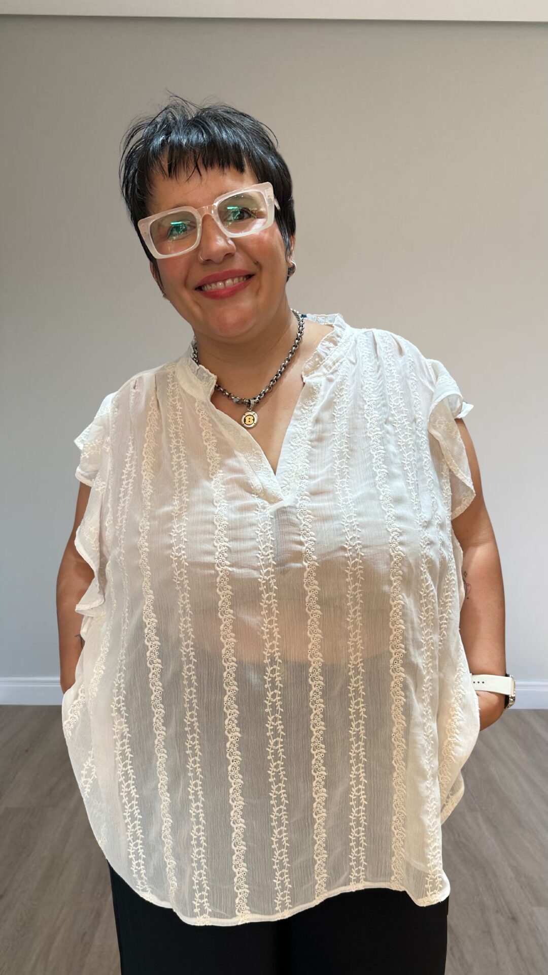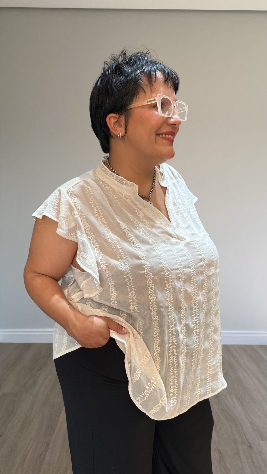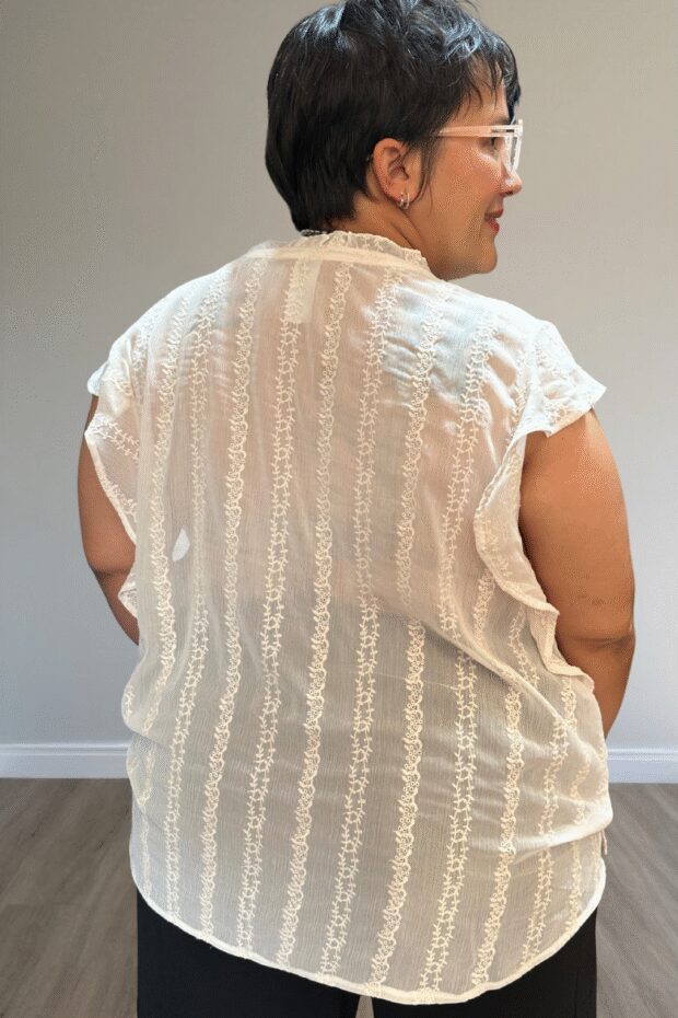 La blusa tiene cuello con frunce, terminando en escote V con carteras. En los hombros delanteros tiene 2 pinzas. Manga tipo volado.