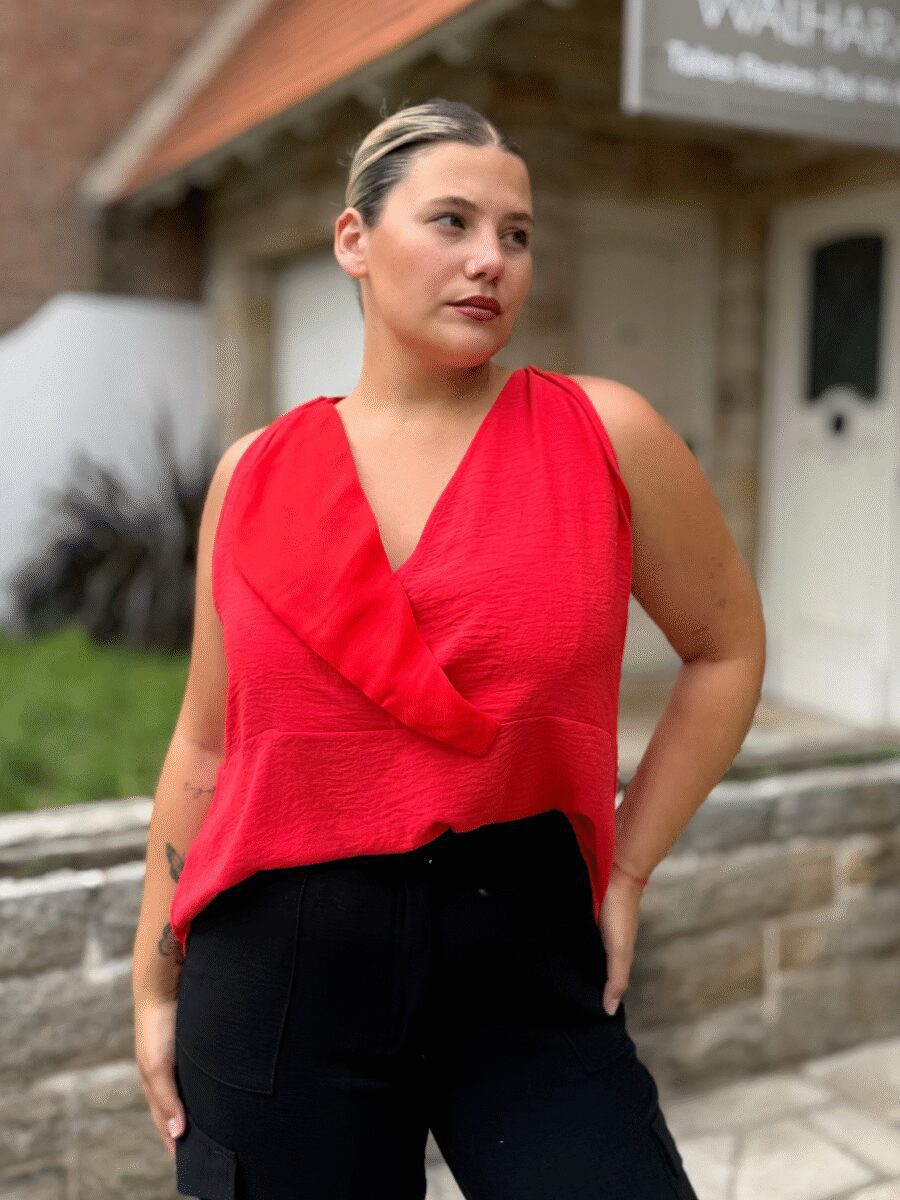Descripción: Blusa escote cruzado con solapa de gasa y lazo en espalda para atar