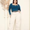 Tela: crep cey. Es una tela plana, con una textura que aparenta apenas arrugadita y tiene buen rebote a pesar de ser una tela plana.
