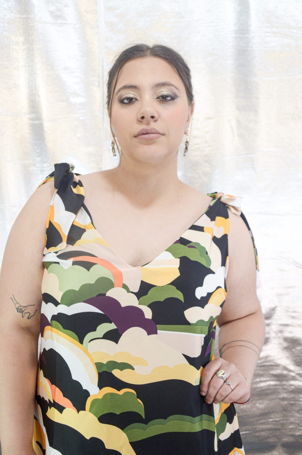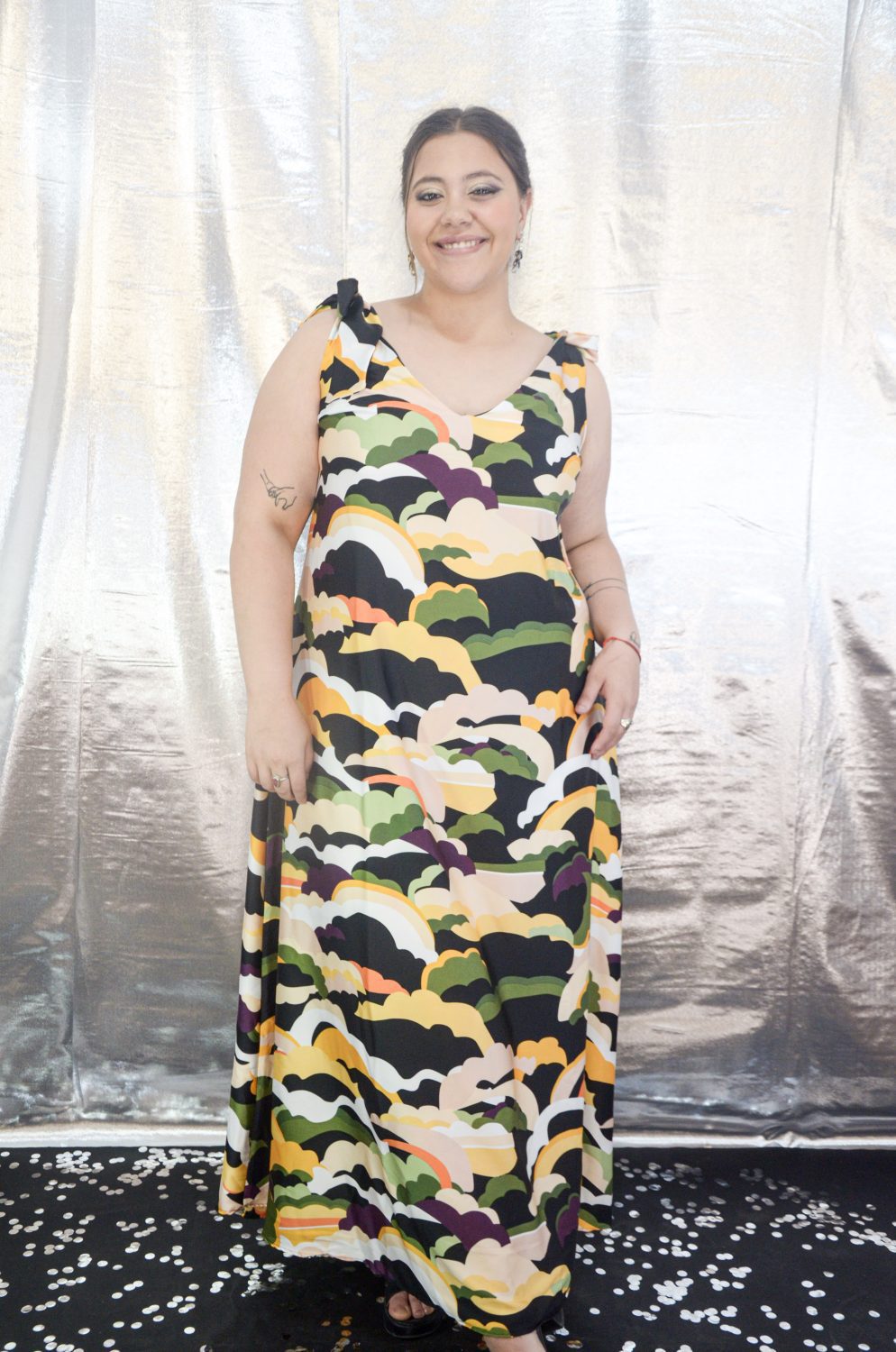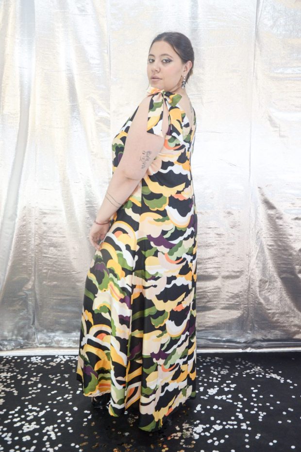 Vestido se seda crepe, escote en V en espejo, los breteles se anudan para ajustar a medida, tiene corte evasé y la falda tiene muy buena caida.