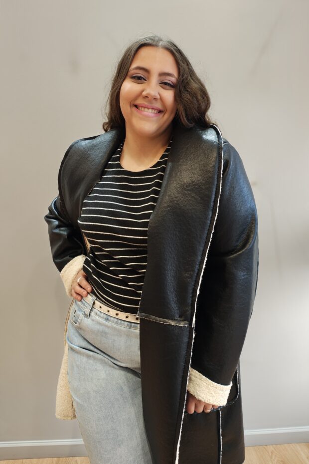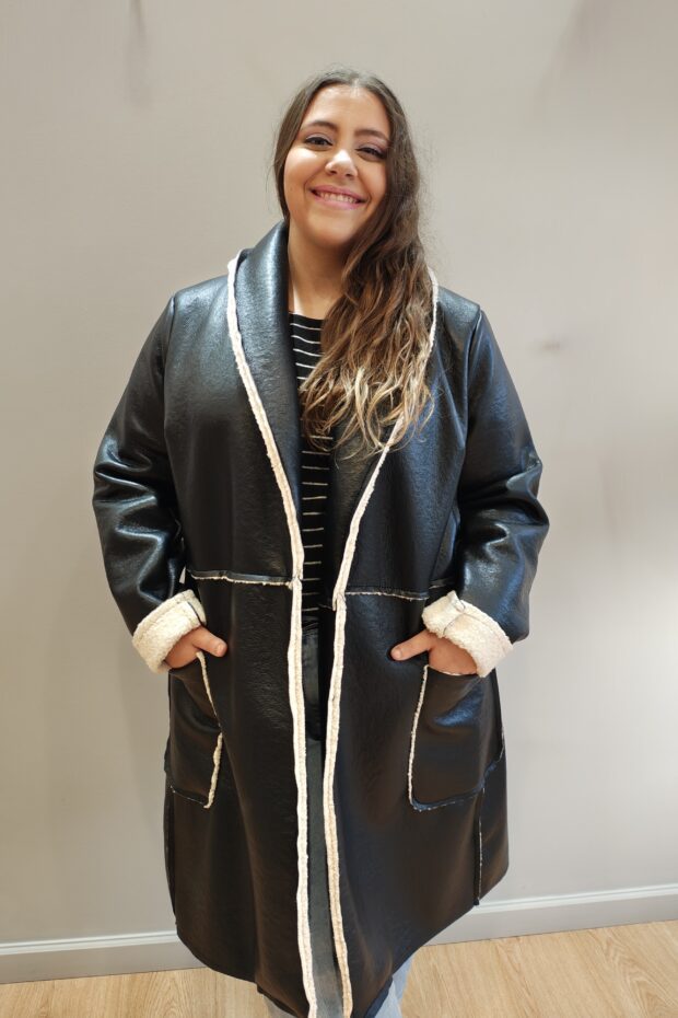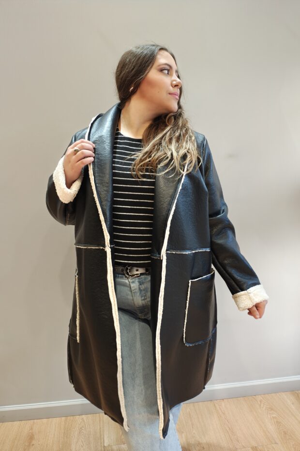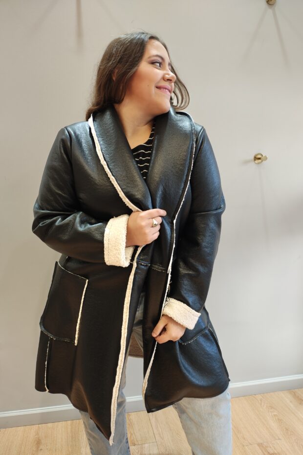 Cuero sintético con corderito adentro en crudo. Super abrigado y liviano!
