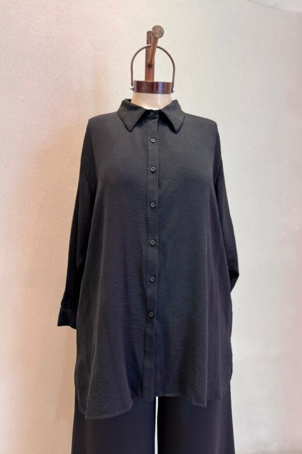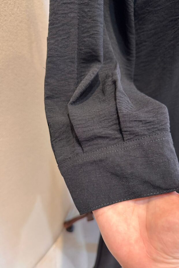 La camisa es larga con tajos en costados, manga larga con tablas, cartera y puño.