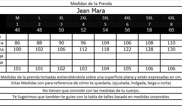 Tabla de Medidas de la Prenda: