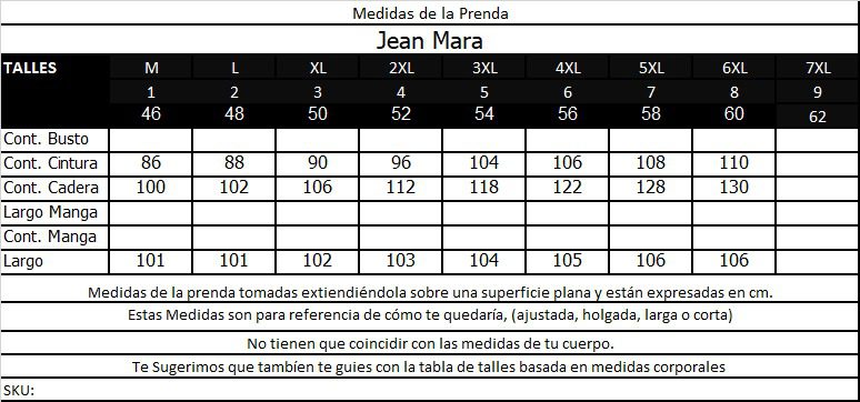 Cont. de Busto: 110 cm., Cont. de Cintura: 100 cm., Cont. de Cadera: 125 cm.
