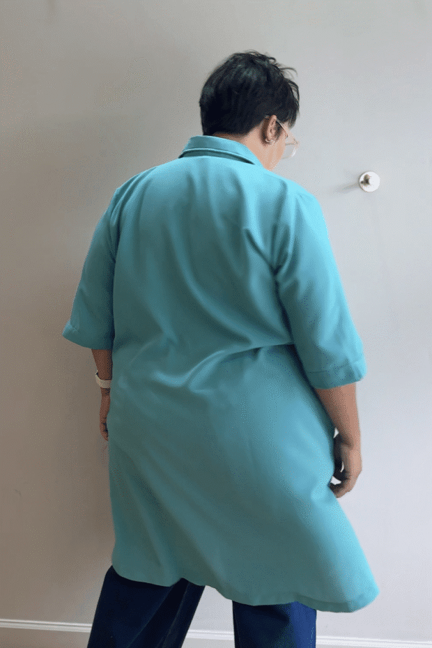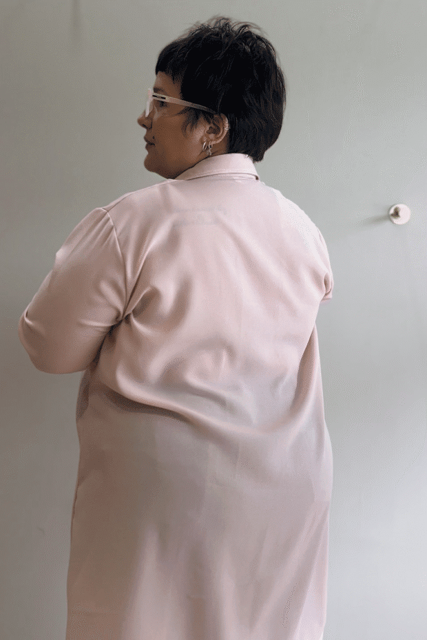 Confeccionada en crepe georgette, se destaca por su caída liviana y fluida, que se adapta al movimiento del cuerpo sin marcar. Su diseño largo y abotonado estiliza la silueta, mientras que el tajo lateral aporta amplitud y un toque moderno.