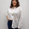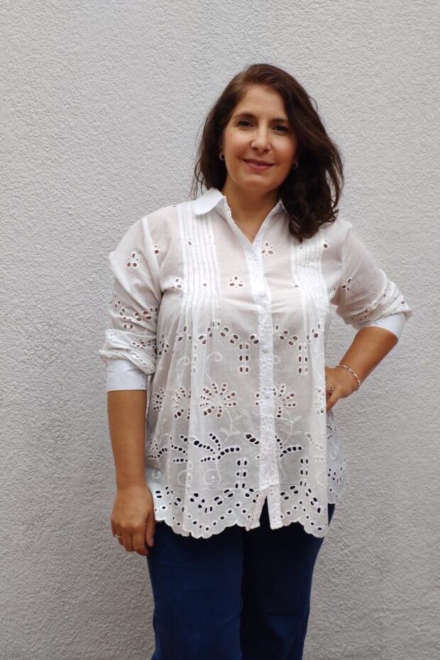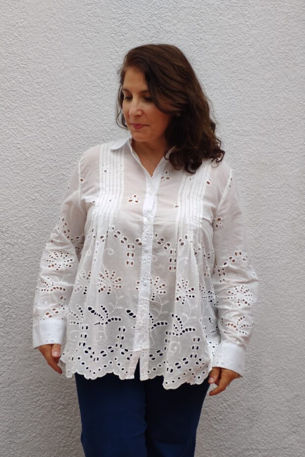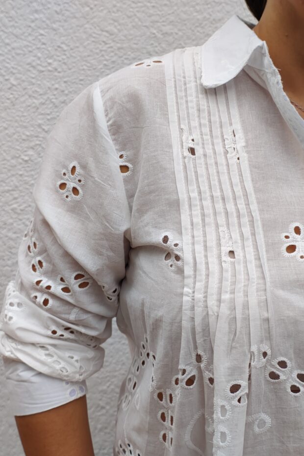 Camisa Broderie Blanco. con cuello solapa y manga marga. tiene detalles del alforzas