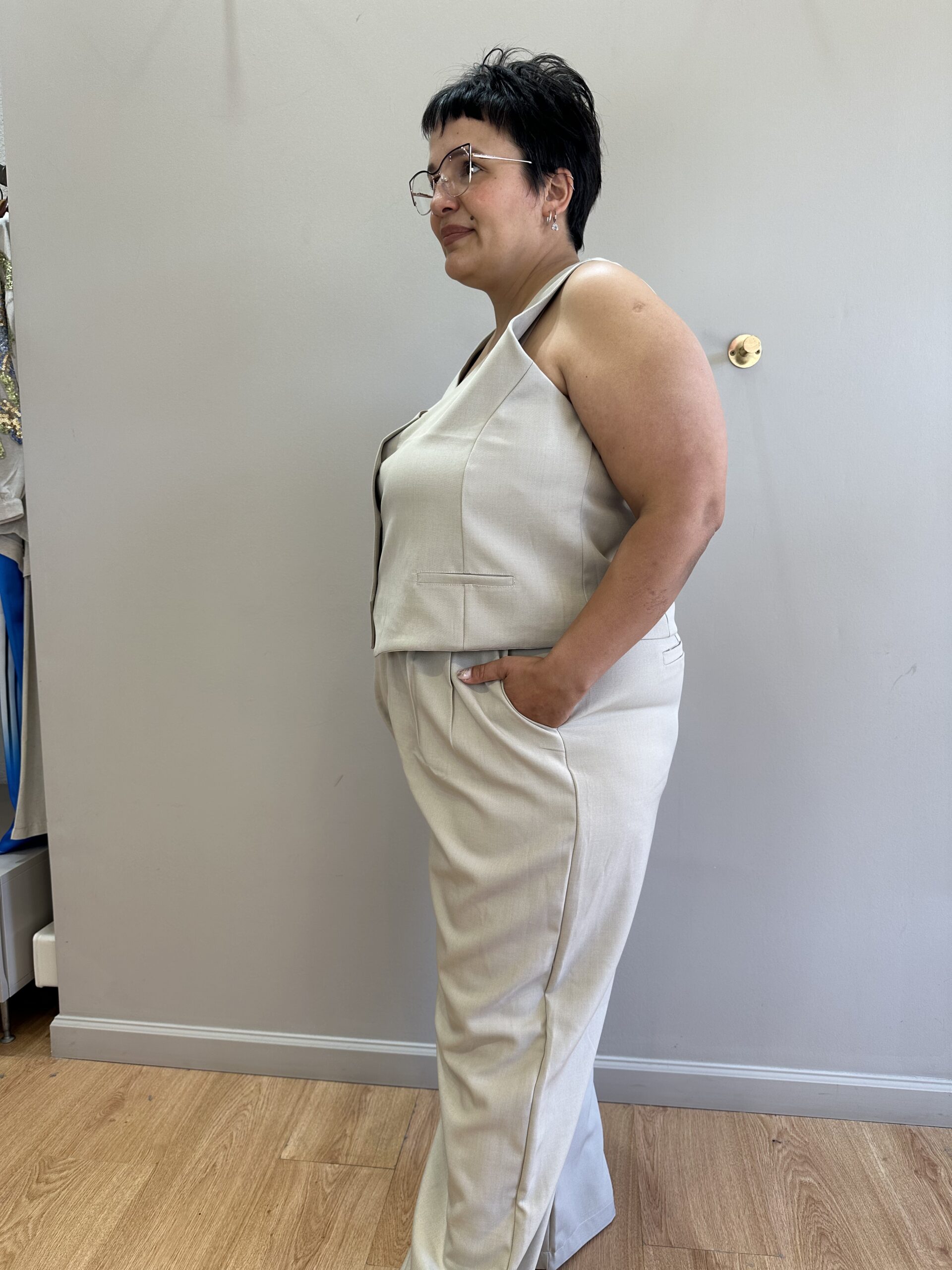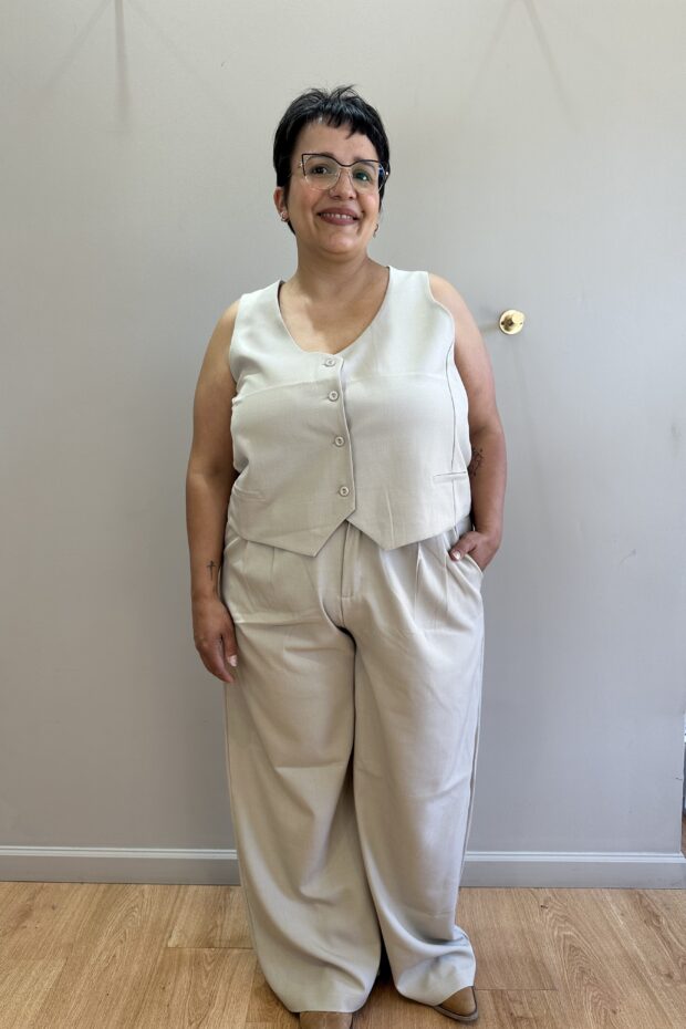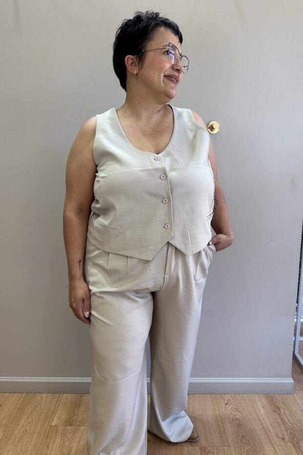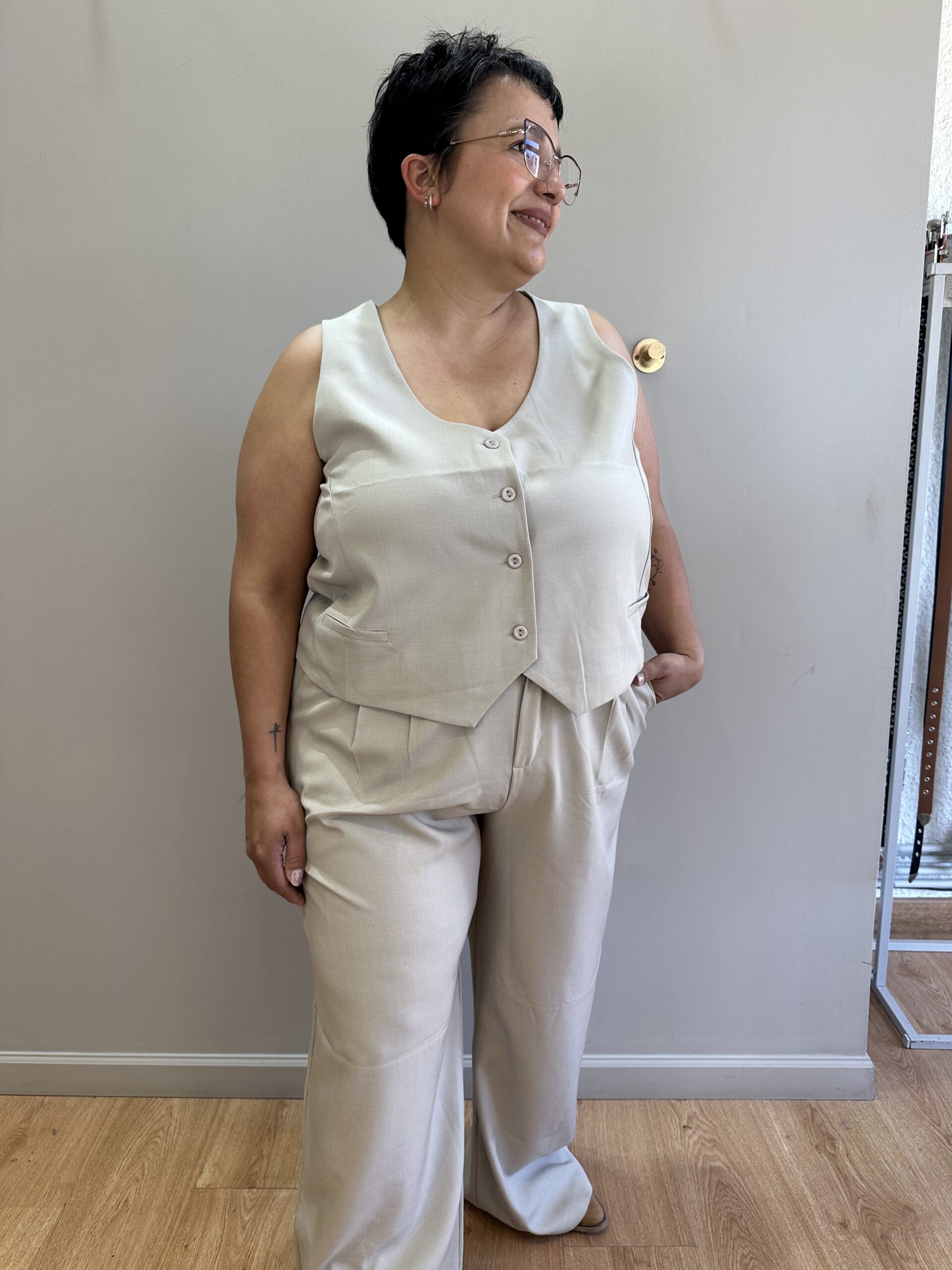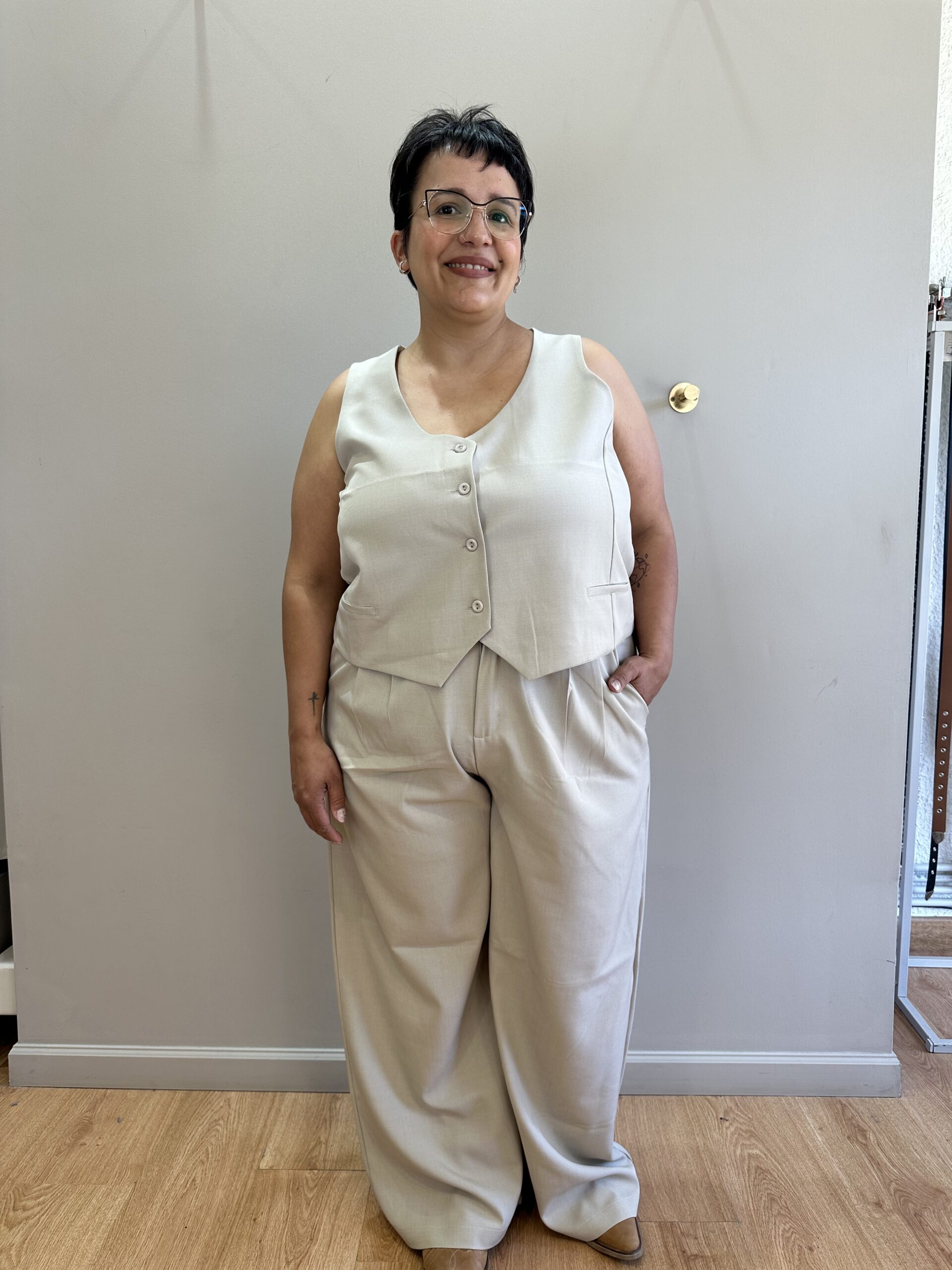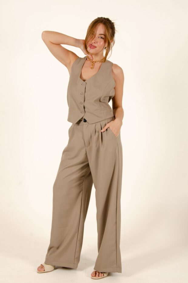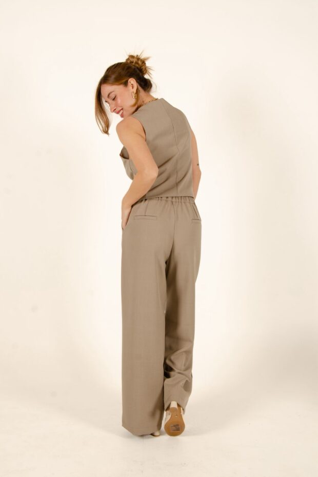 Pantalón Ancho de crepe sastrero con pierna ancha, bolsillos y elastizo en la cintura atrás.