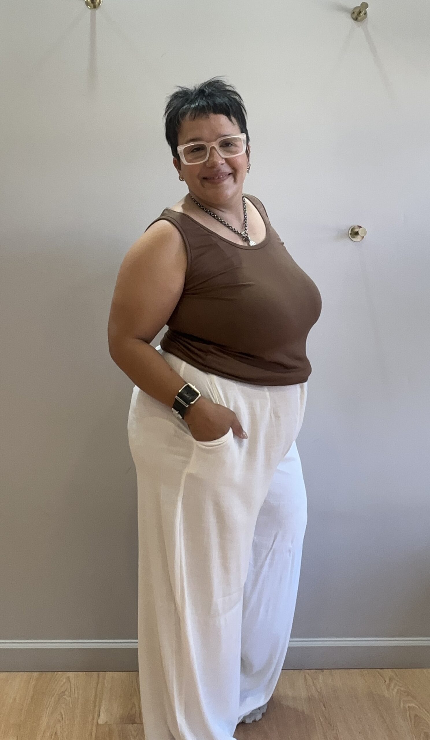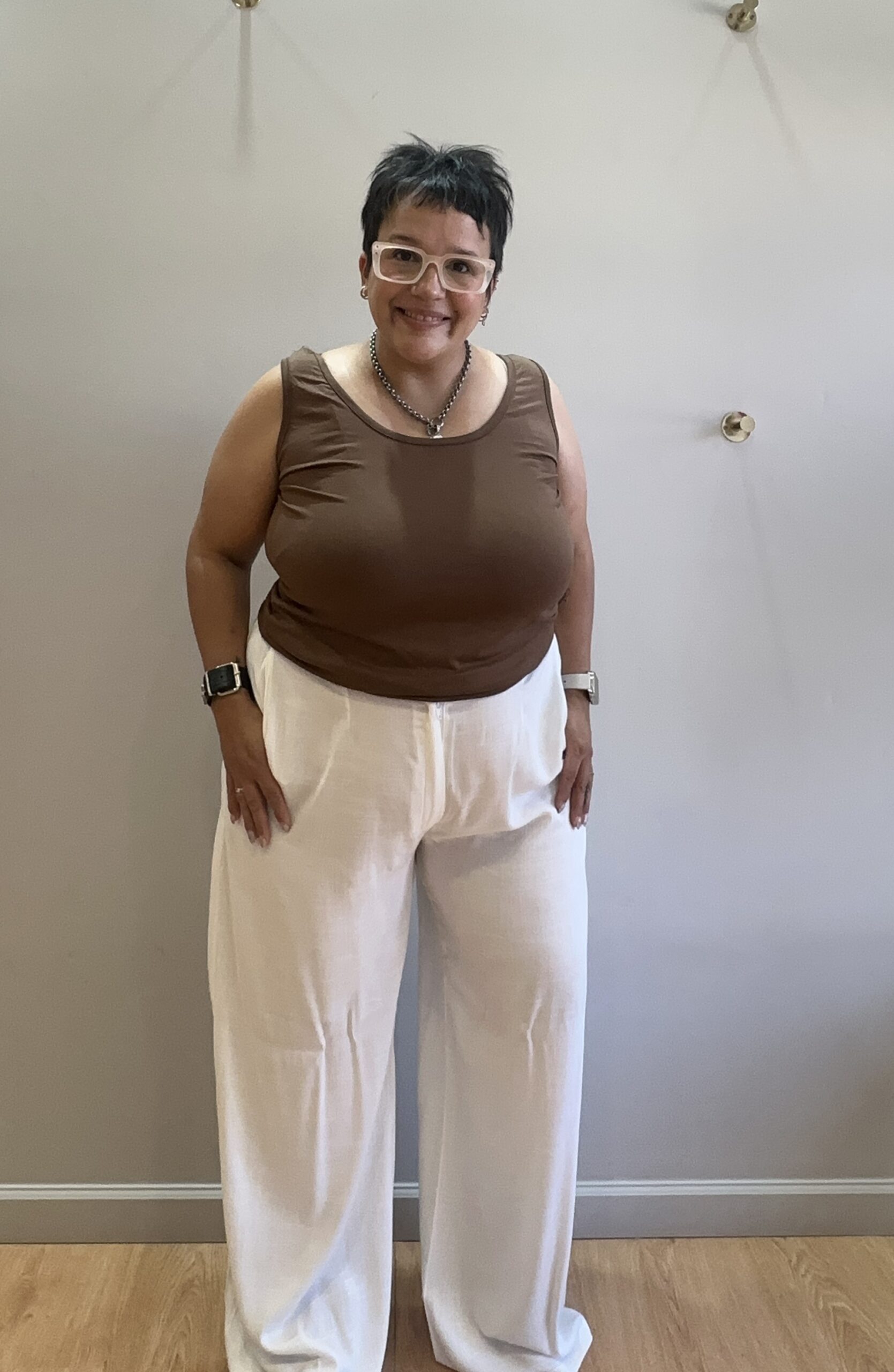 palazo ancho con cintura elastizada. tiene cierre y botón. super fresquito