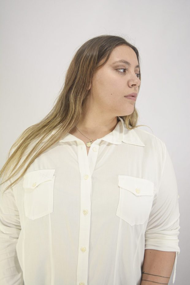 Es una Camisa Clásica entallada, tiene 10 botones con bolsillos, tira en la manga para acortar a 3/4.