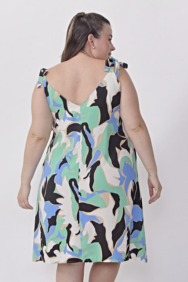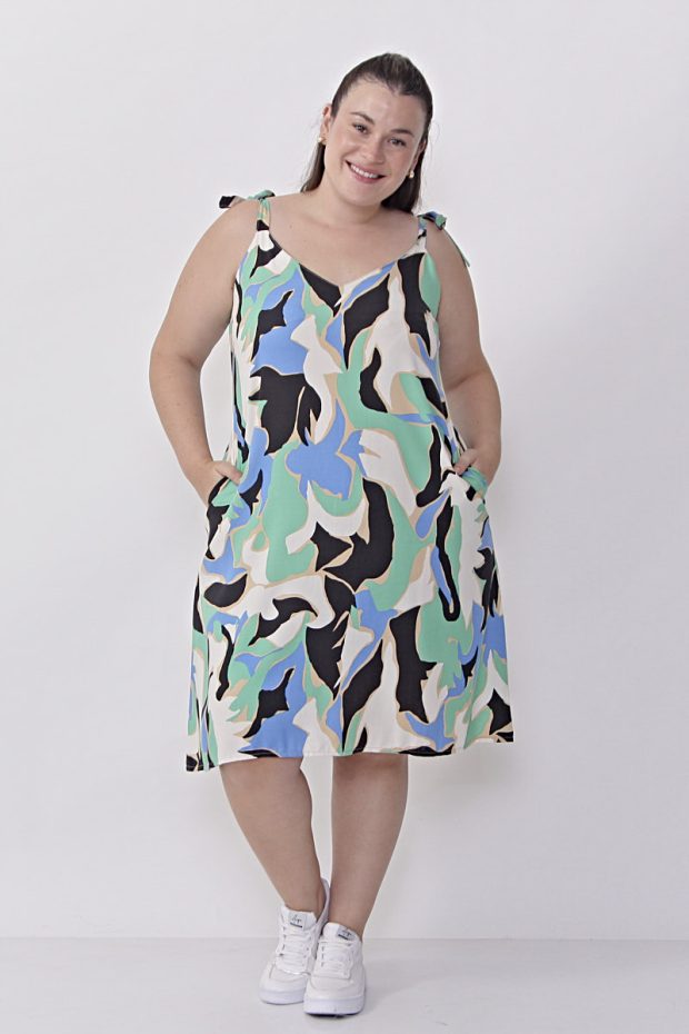 tiene escote en V en espejo, y lazos para anudar en los hombros, con bolsillos.