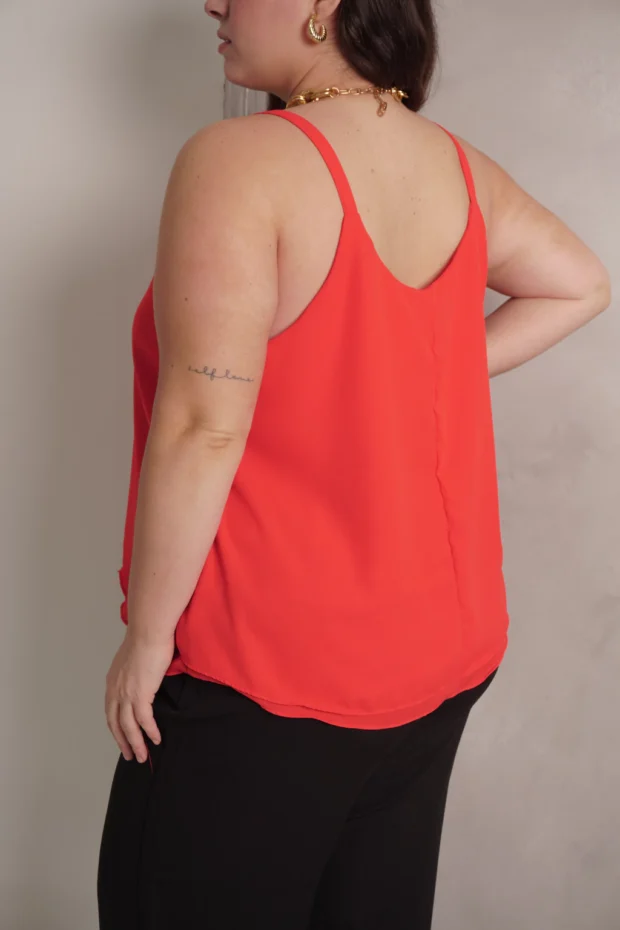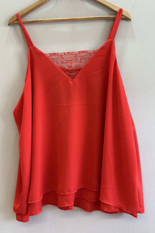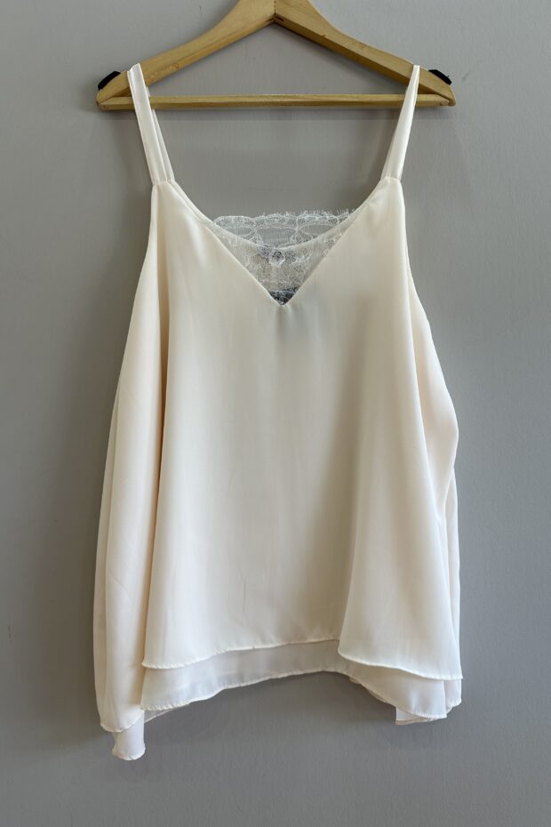 Descripción: Top de gasa crepe doble capa con recorte de encaje en escote