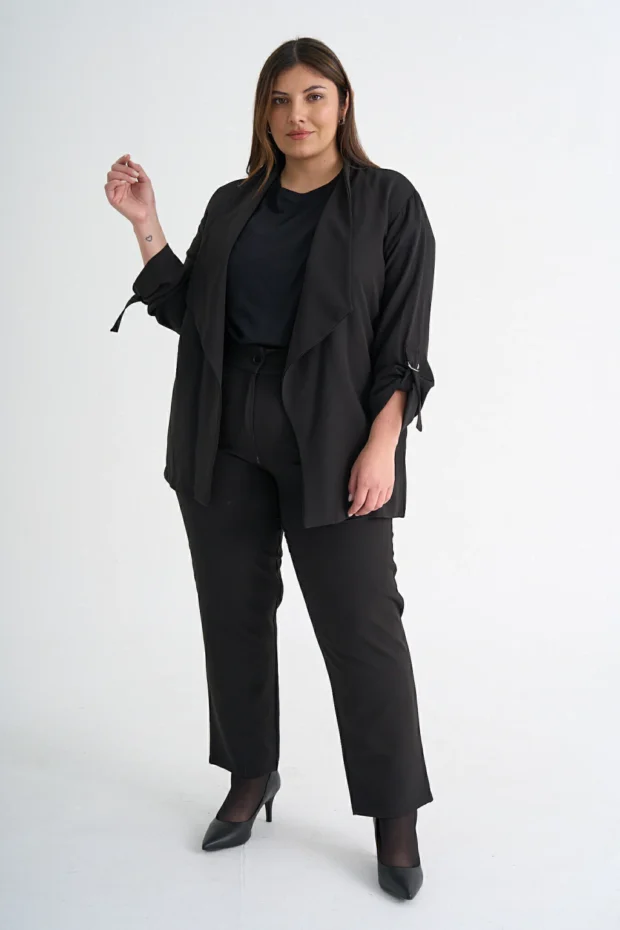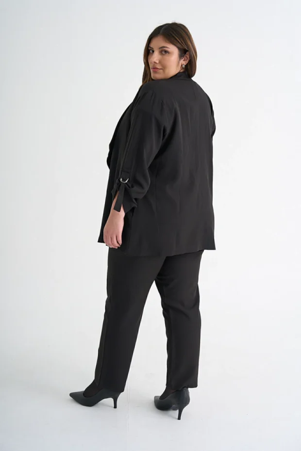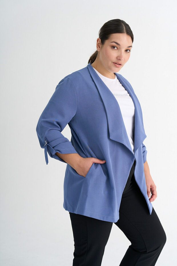 Descripción: Saco de solapa irregular con tiras para ajustar en mangas