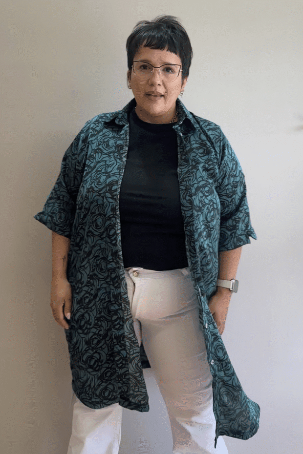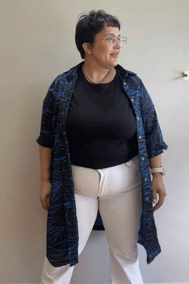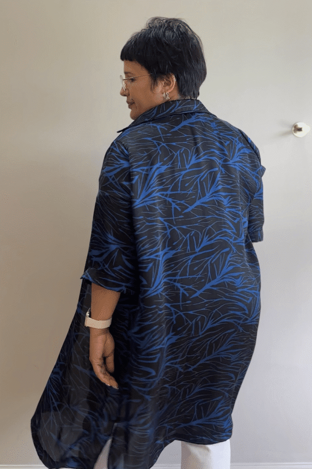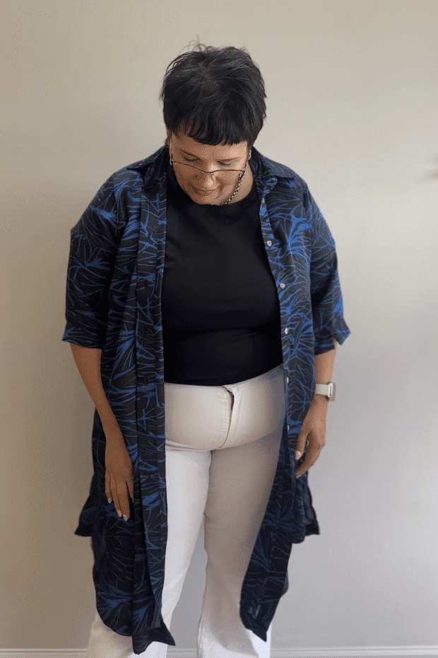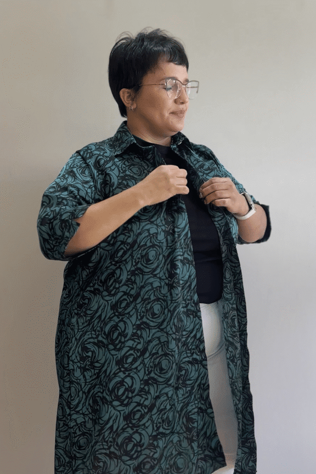 Su diseño largo, abotonado y con tajos laterales estiliza la silueta y permite usarla tanto cerrada como abierta, tipo sobrecamisa. Las mangas con vuelta y el estampado exclusivo aportan un toque moderno que transforma un conjunto básico en un look lleno de personalidad.