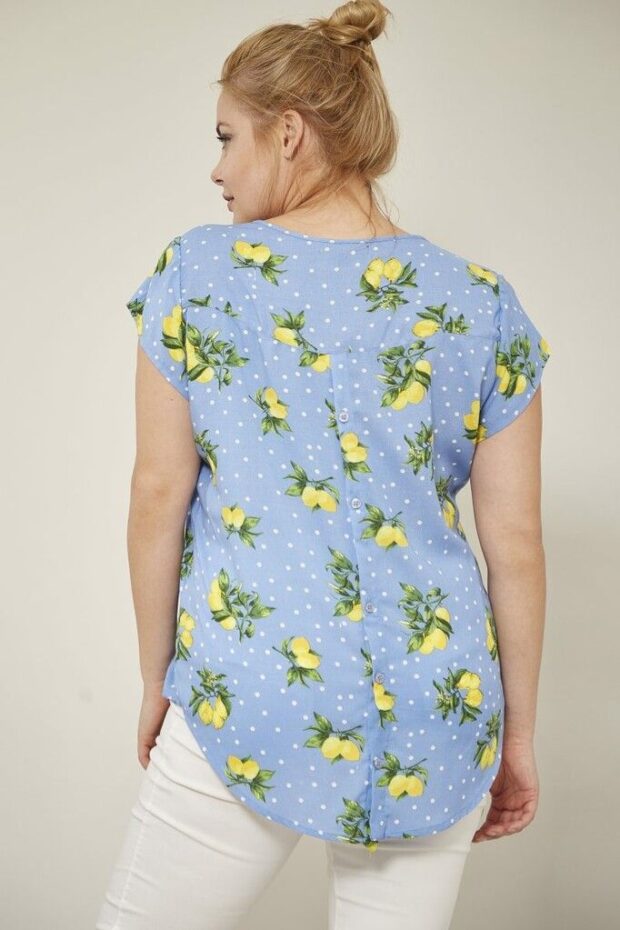 Remera de fibrana color celeste con estampa de limones. Manga corta. Con Botones atras.