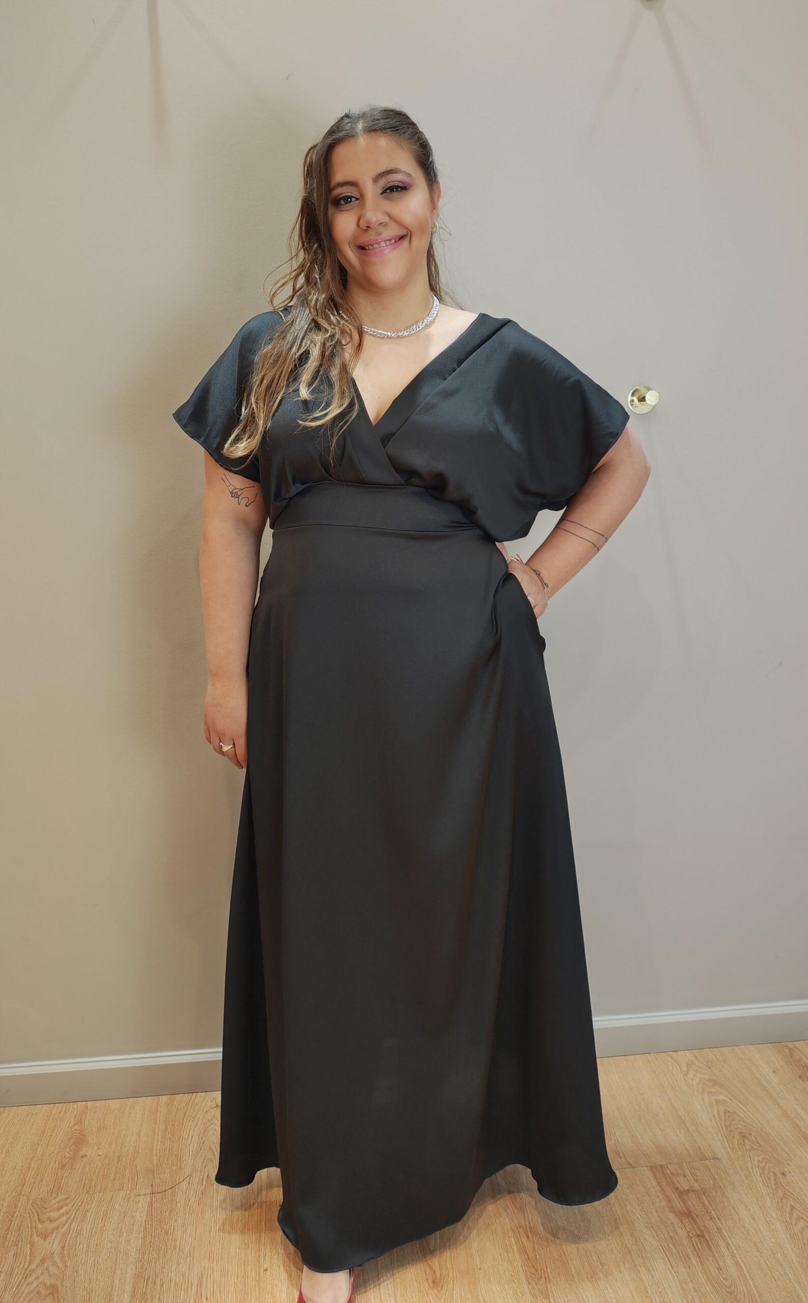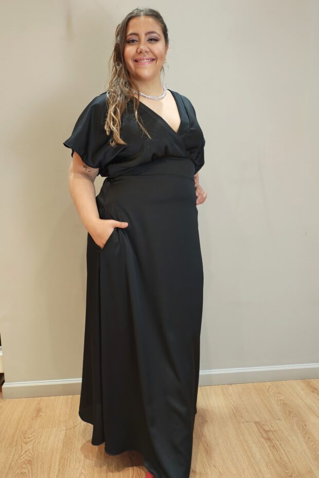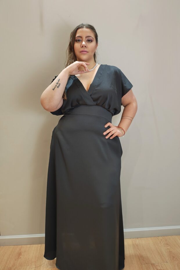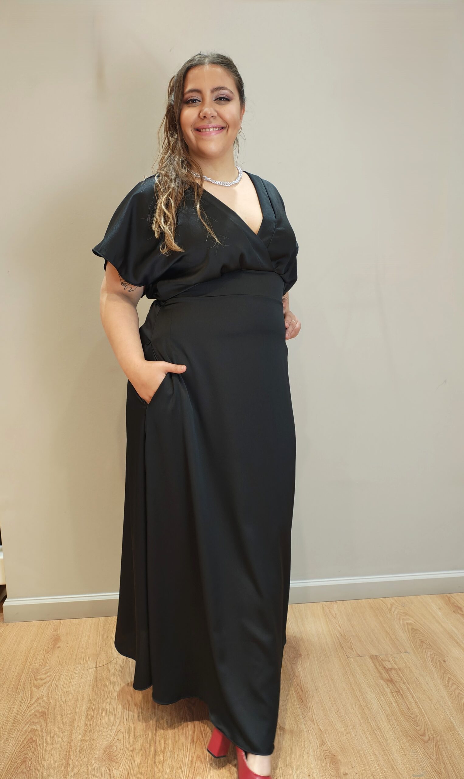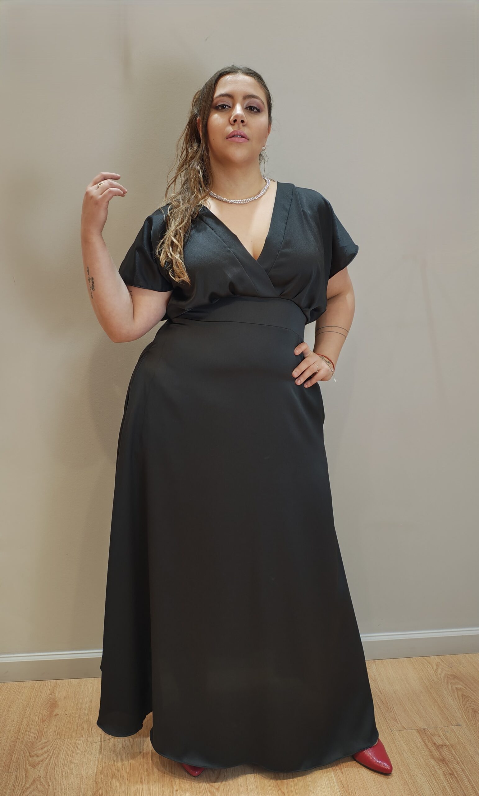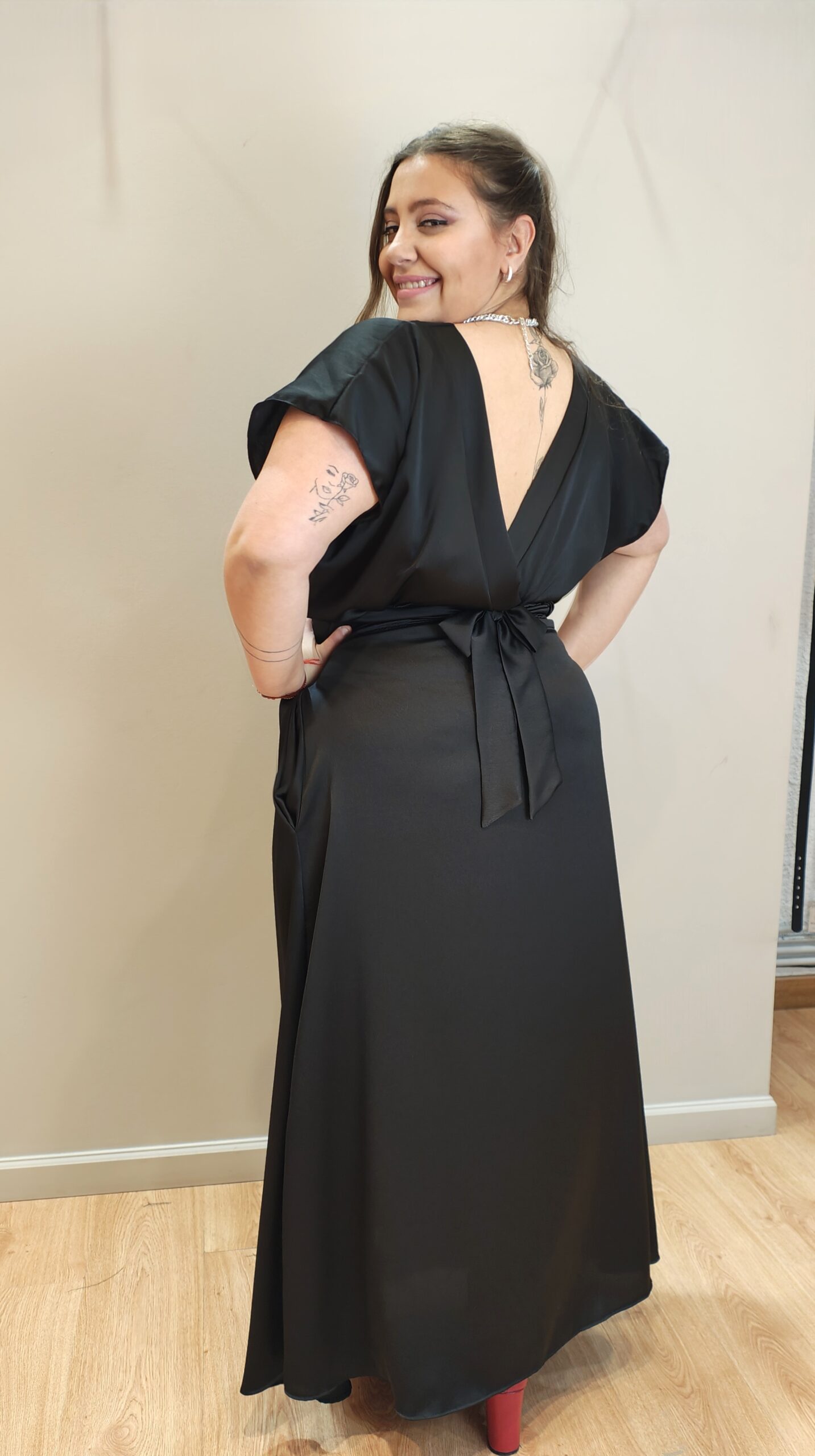 Largo confeccionado en crepe satin Escote cruzado amplio en V adelante y espalda en espejo con cintura ancha y elástico y costura atrás. Falda evasé amplia.