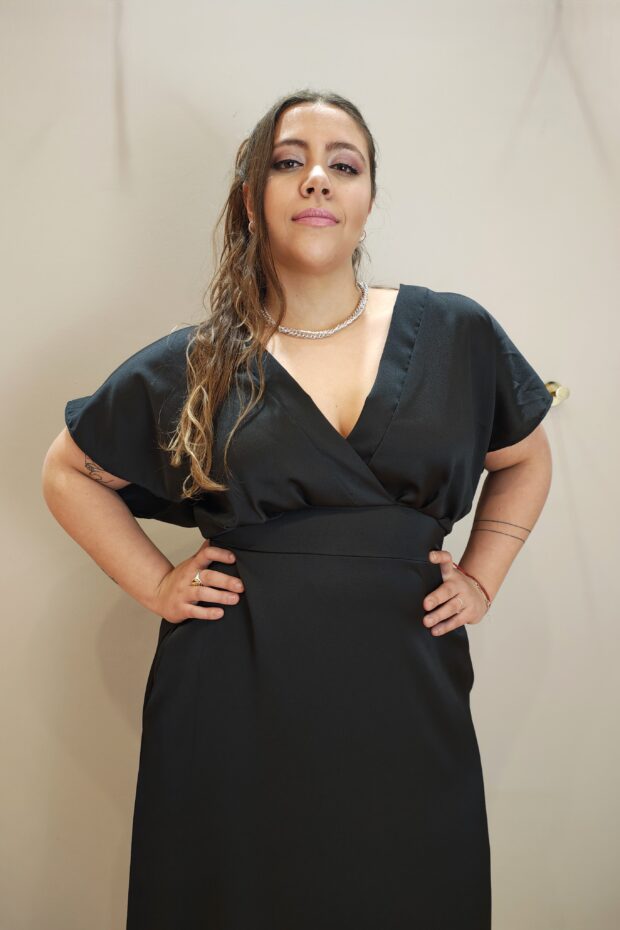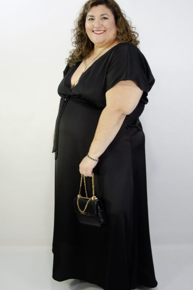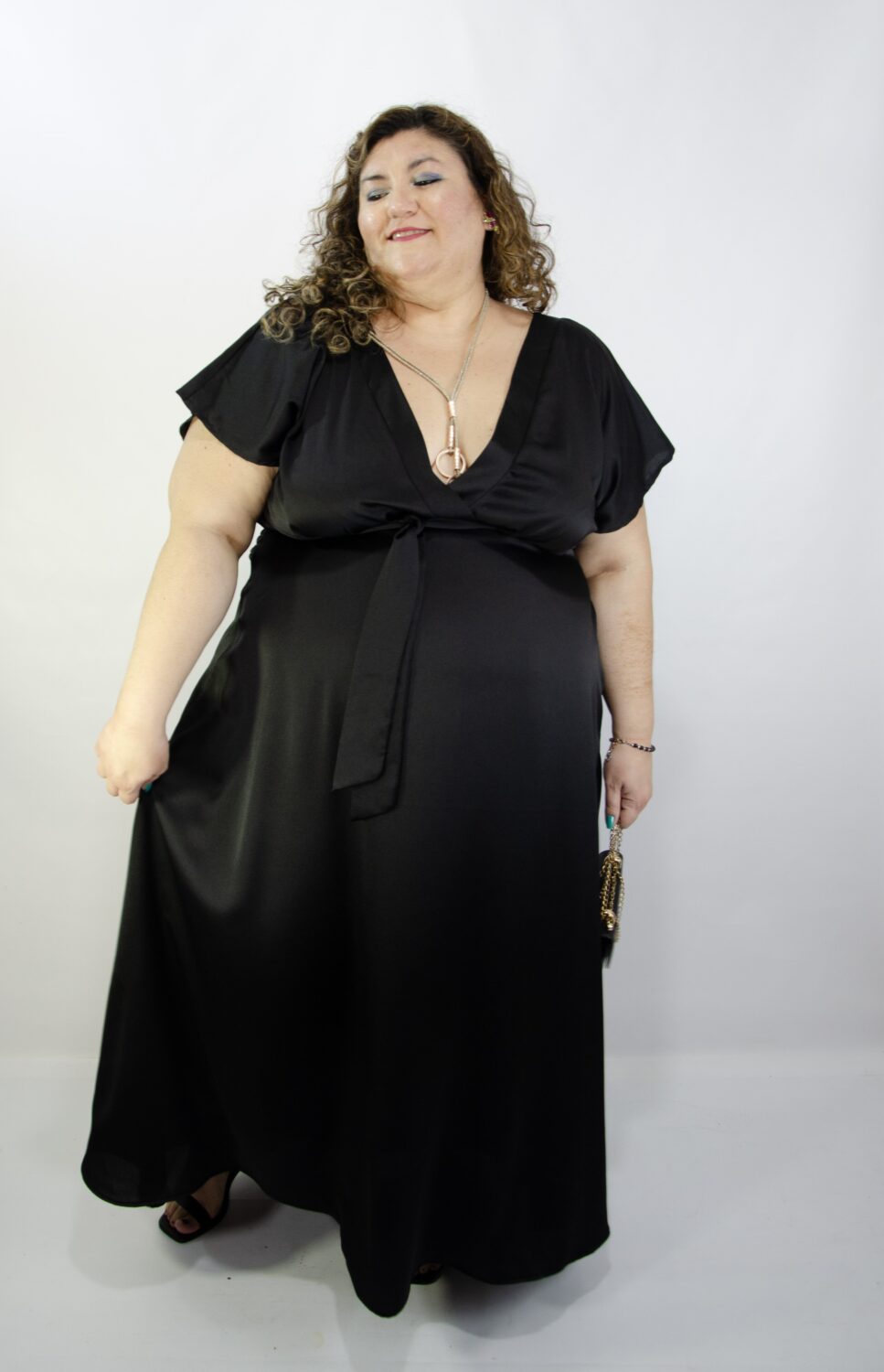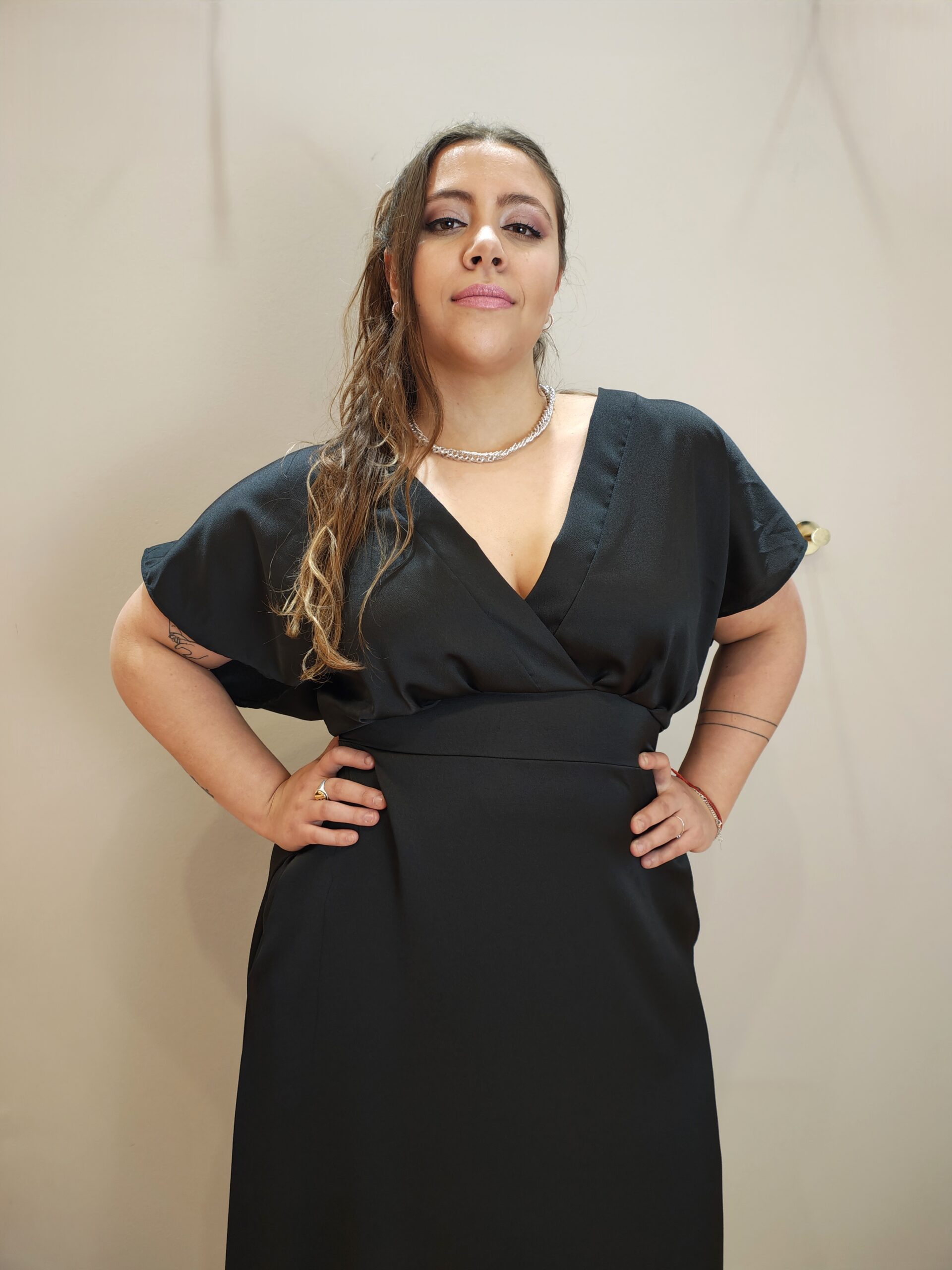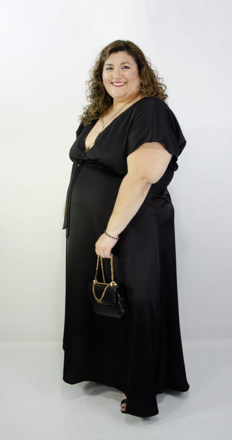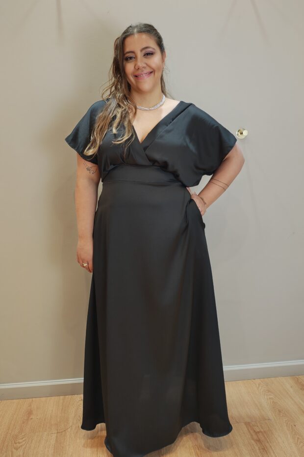 Largo confeccionado en crepe satin Escote cruzado amplio en V adelante y espalda en espejo con cintura ancha y elástico y costura atrás. Falda evasé amplia.