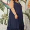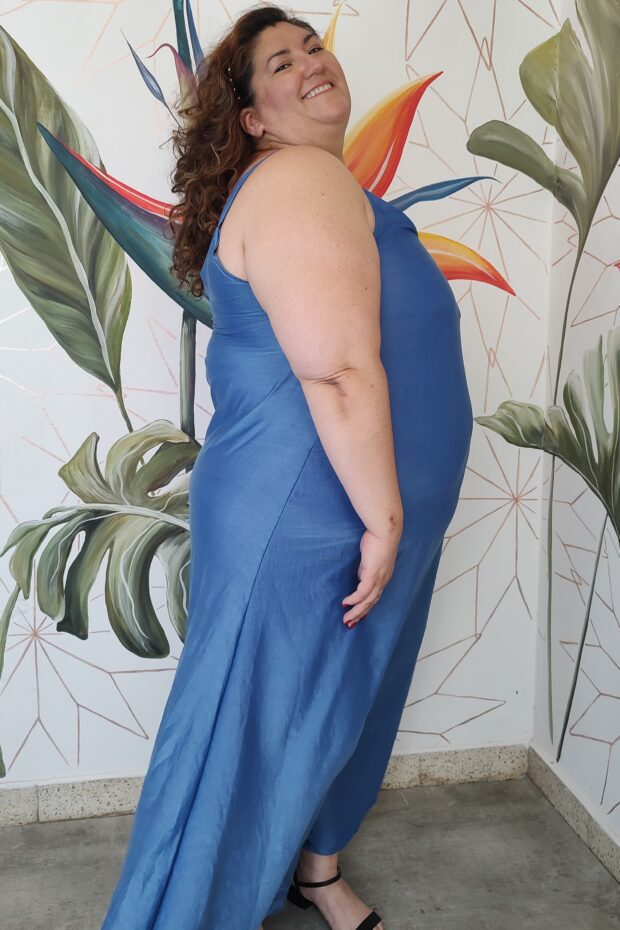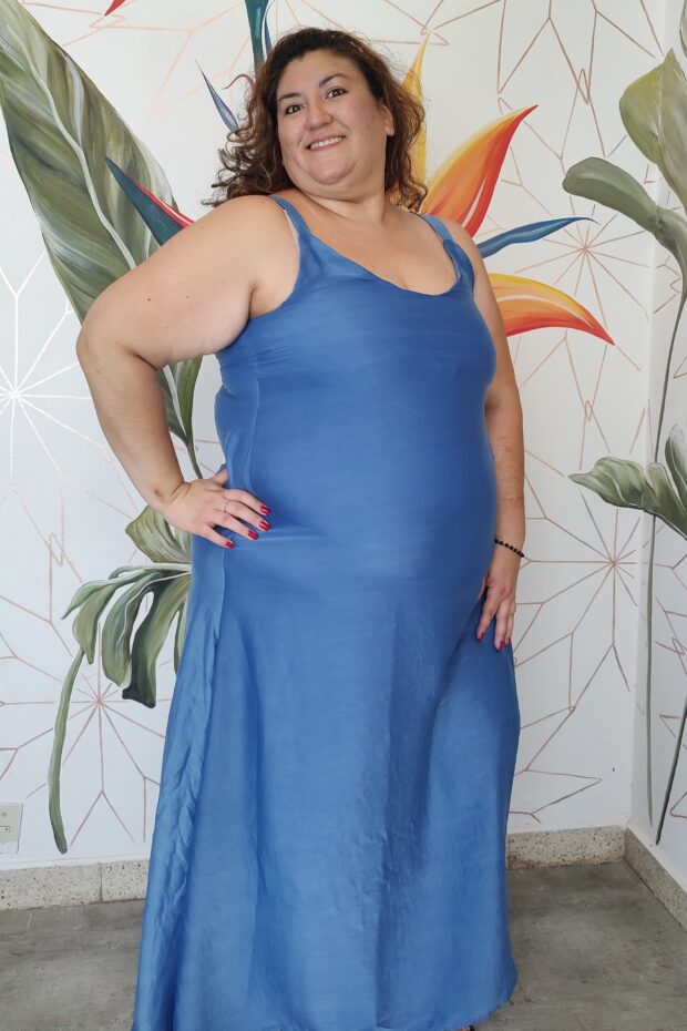 Vestido Largo de seda con buena caída, con cuello en V amplio breteles anchos.