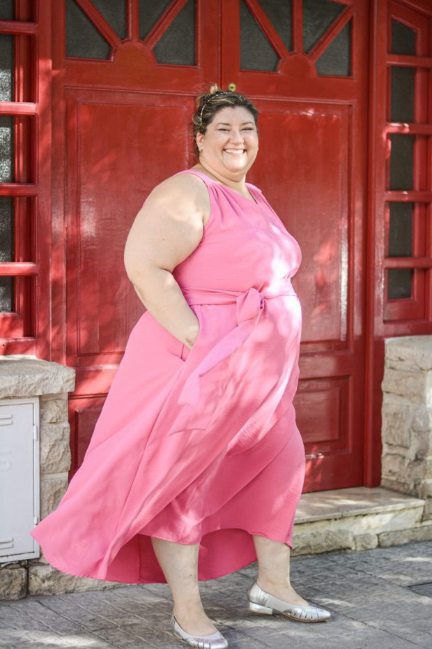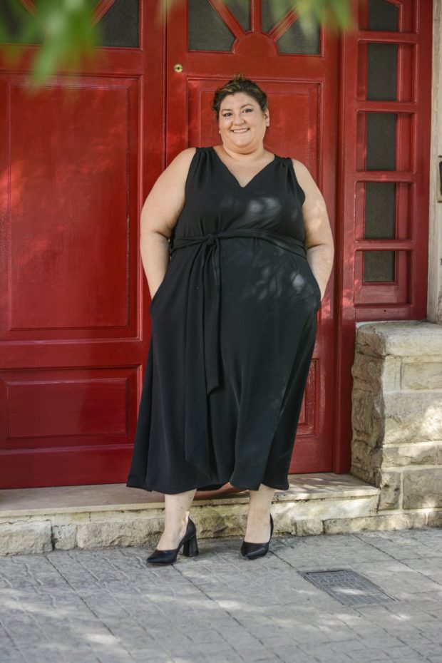 Vestido multitalle confeccionado en crepe bambula con canesú en la espalda que con un lazo se ajusta adelante y se ajusta a medida.