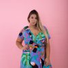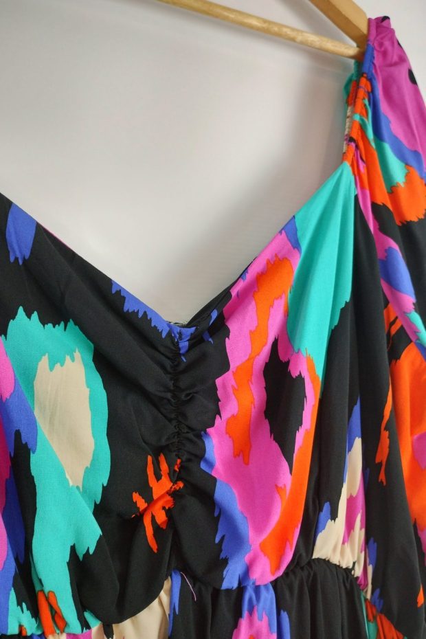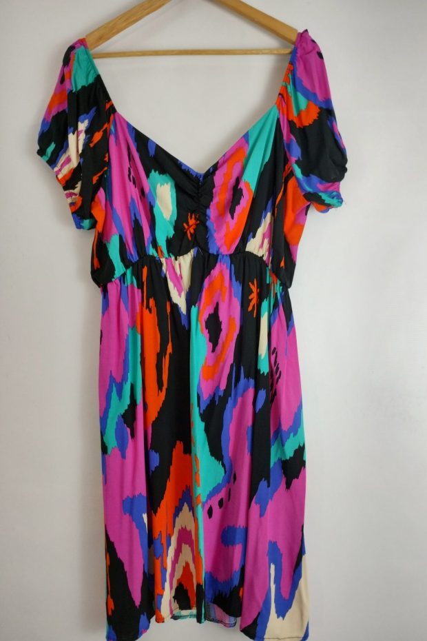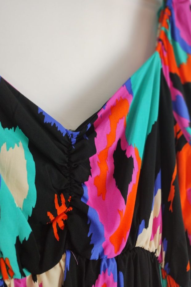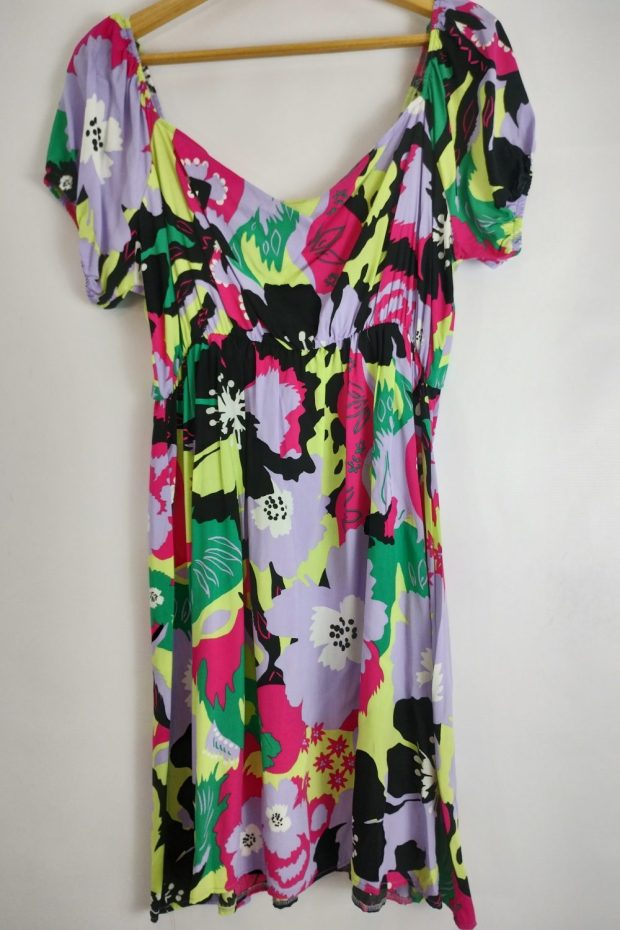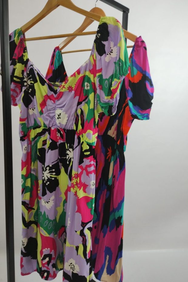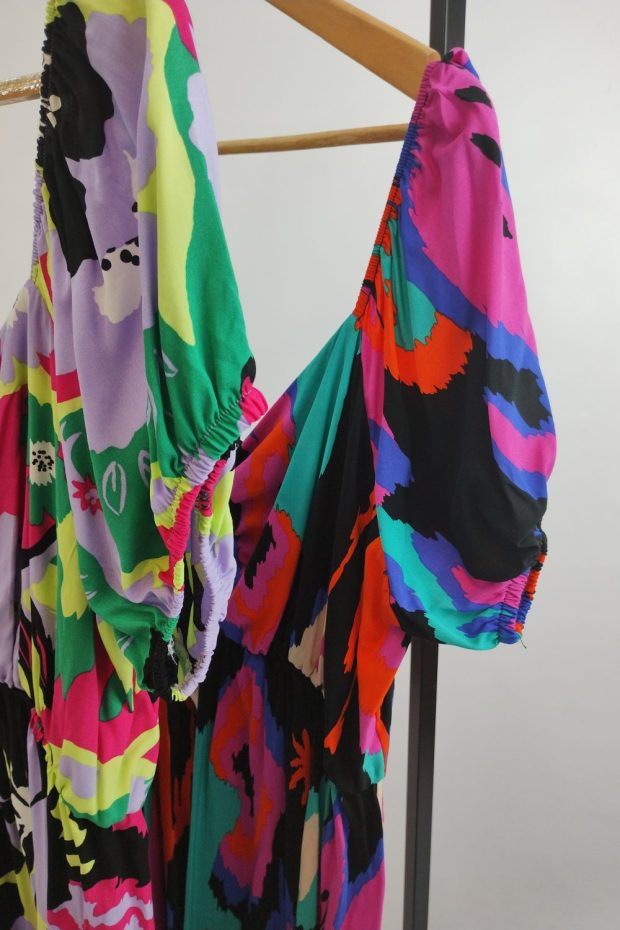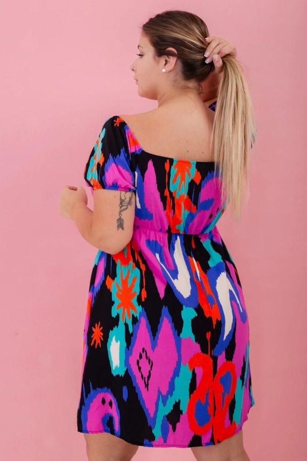 Vestido corto estampado fibrana, manga princesa. con corte bajo busto con elástico que estira 20/30 cm.