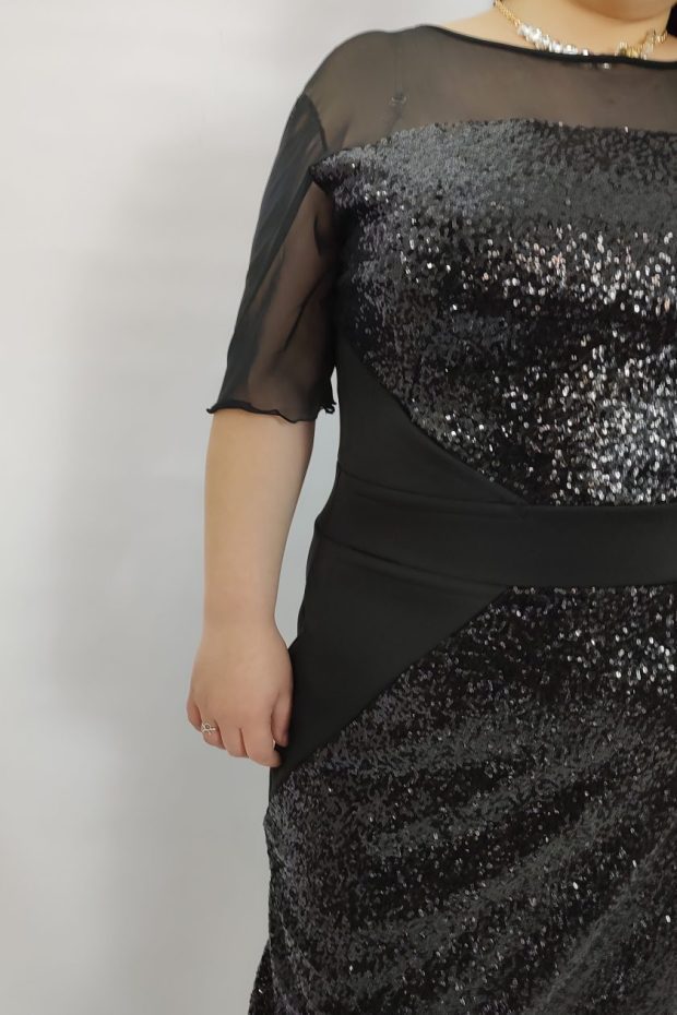 Vestido de jersey de seda con recortes y lentejuelas, el escote es de tul elastizado, tiene entalle en la cintura y cierre.